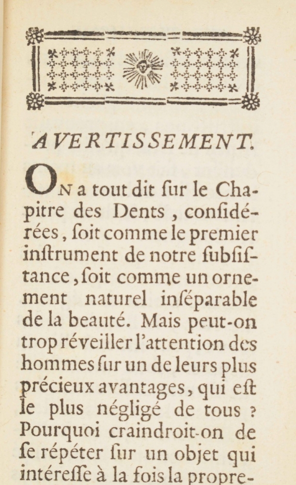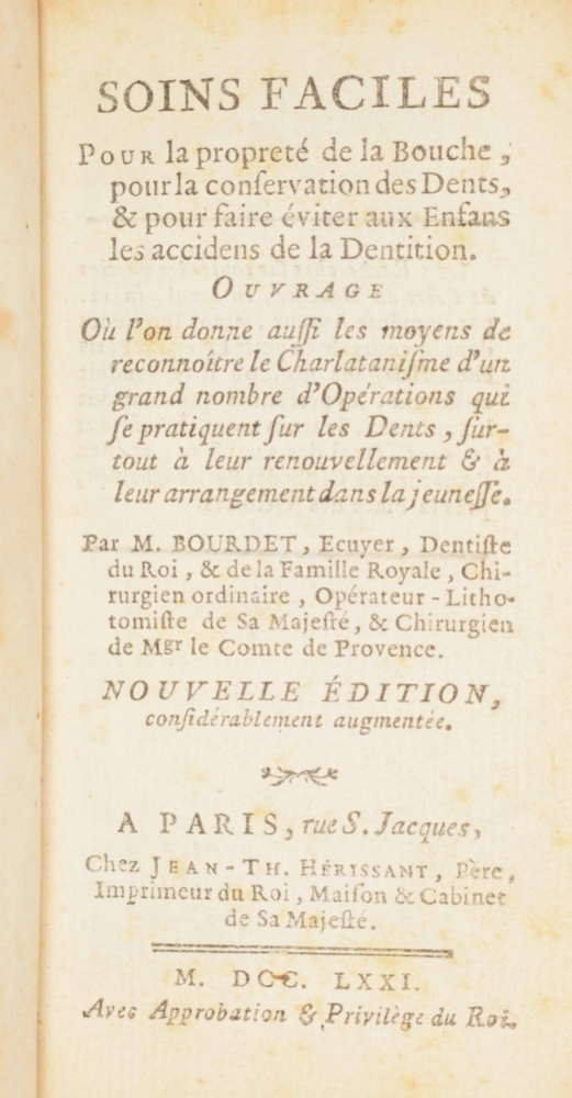 pour la conservation des Dents, & pour faire éviter aux Enfans les accidens de la Dentition (...). Nouvelle édition. Paris, 1771. 16mo, (3),248,(3) p. Calf, spine and edges worn.