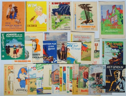 See the Dutch description: LOT met 26 proefdrukken van omslagen van kinderboeken, allen uitgegeven door Callenbach, Nijkerk. o.a. Ons zonnig thuis door T. Bokma; Hein, hek en henkie door A. Grimme en Naar zee door A. Wapenaar. Het betreft meest de voorkant en de rug. (totaal 26)