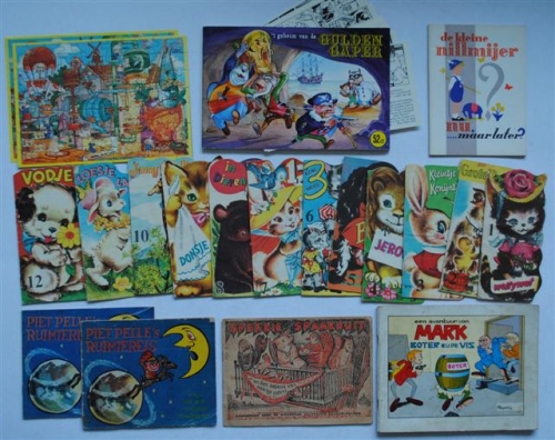 See the Dutch description: STIP, KEES. Piet Pelle's ruimtereis. Tekst Kees Stip. Tekeningen Guus Boissevain. Uitgave Gazelle. (2x) + HILDEBRAND, A.D. Spekkie Spaarduit en het balkon van Maartje merel. Tekeningen van Charles Kemper. Uitgave Spaarbank Hilversum-Bussum-Huizen. -n: 16 andere (totaal 19)