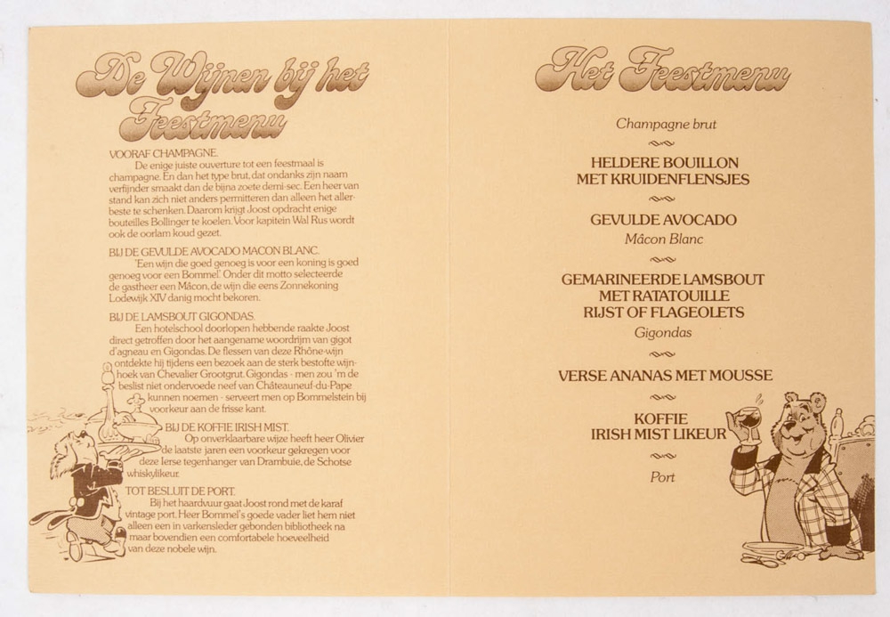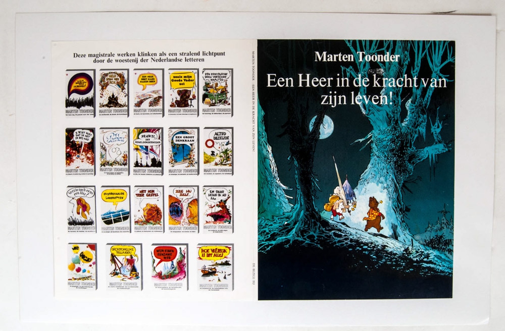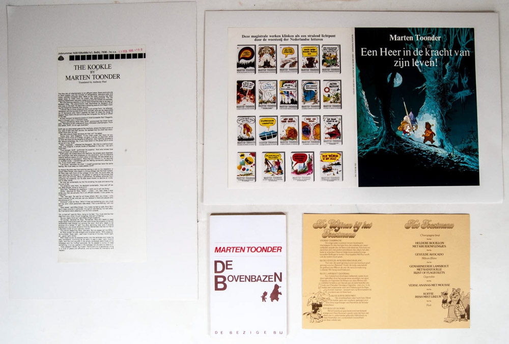 De Bovenbazen. Dummy with stamp "Archiefexemplaar van de Bezige Bij" on back + proofs of final cover of 5th edition in 1985 + proof design "De Andere Wereld" in silver with blue title. 29 x 25,5 cm - and 3 others + The Kookle by Marten Toonder. Translated by Anthony Paul. Los leaf on paper. Top shows job number Bezige Bij and stamp 17 Feb. 1986. 36,5 x 15 cm.