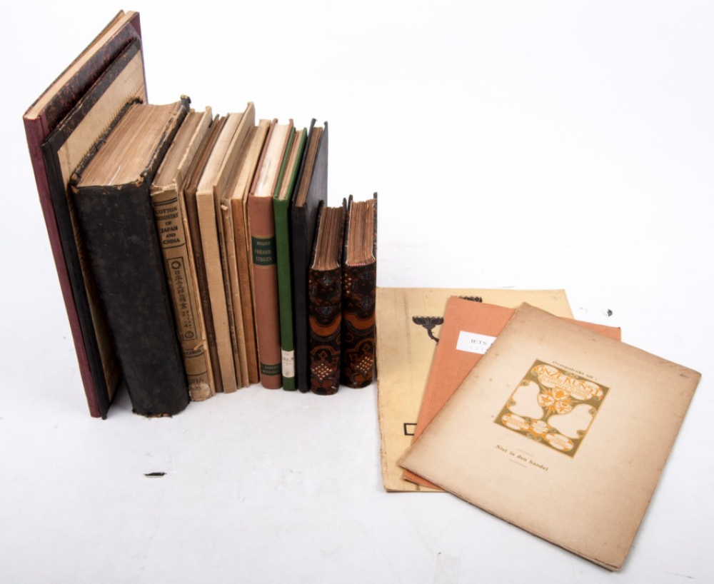 With: Geklopte boomschors als kleedingstof op Midden-Celebes en hare geographische verspreiding in Indonesië door N. Adriani en Alb. C. Kruyt. Met aanteekeningen, register, aanvullingen en verbeteringen van J.D.E. Schmeltz. Leiden, E.J. Brill, 1905, (4),78 p., frontispiece and 5 chromolithographic prints, illustrations, contemporary half-cloth, large 4to.