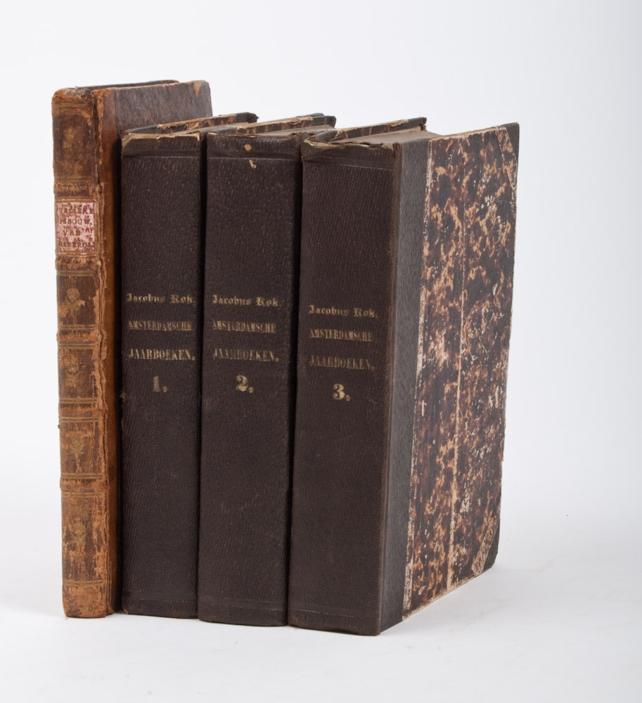 8vo., half leather, 220 pp., complete with a folding map of Amsterdam, binding shows signs of use. Good. Combined with Amsterdamsche Jaarboeken, in 3 vols. by Jacobus Kok, J.B. Elwe, Amsterdam, 1781 with a frontispiece, a plan, 14 copper engravings of churches, towers, city hall and a plan of the Battle of Dogger Bank; these complete but incorrectly bound. (total 4)