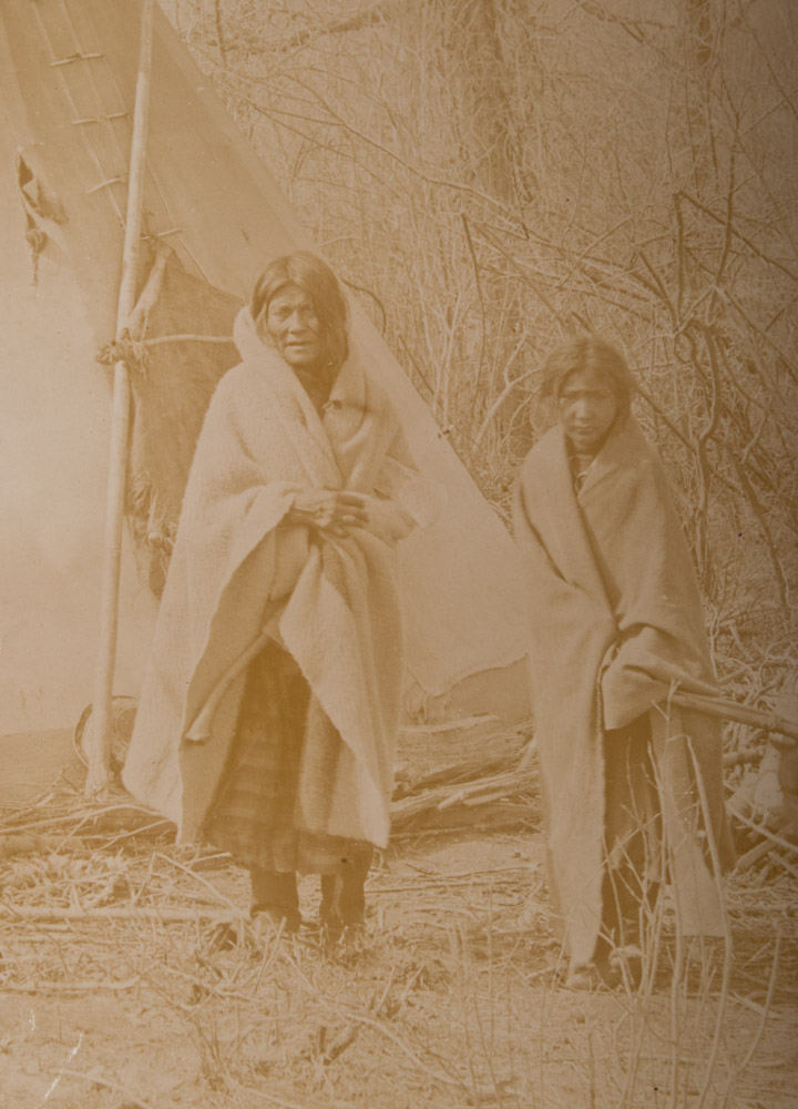 Iconic photograph of Indians, the women in this Indian family are depicted in front of their tipi, one sitting with a small child, the older next to an older child and their dog, who is used as a pack animal for gathering wood. On the website of the Provincial Archives of Alberta the photograph is attributed to Ernest Brown and dated ca. 1891-1904, with the technique listed as Gelatin Dry Plate Negative. The photograph is also published (coloured) as postcard.