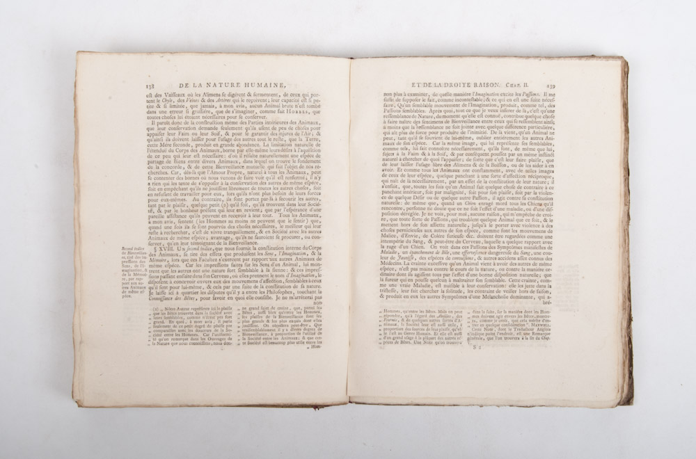 4to, half-leather, gilt-stamped title on spine, title in red and black with printer's vignette, XXVIII,(2)435,(1),(8) pp., spine and plates rubbed. This is a translation of De Legibus Naturae in which Richard Cumberland propagates utilitarianism, but opposes the egocentric ethics of Thomas Hobbes; with explanatory notes by Jean Barbeyrac, professor in Groningen. Barbeyrac translated the 3 most important works w.r.t. natural law in the 17th century, i.e. the work mentioned above, Samuel Pufendorf's De Jure Naturae et Gentium and Hugo de Groot's De Jure Belli et Pacis.