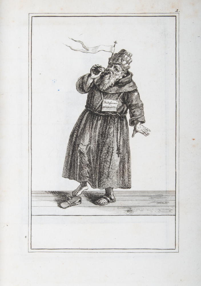 par les desordres du monachisme. Enrichie de 50 figures. On les vend en Hollande, chez les Marchands Libraires et Imagers. Avec privilege d'Innocent XI. N.pl., n.d. (ca. 1850), 15 text pages, folding engraved frontispiece after Romeyn de Hooghe, 50 engraved plates after Jacob Gole and Cornelis Dusart, contemporary half morocco with gilt lettered spine and gilt top edge, 4to (excellent copy with unidentified heraldic ex libris on inside front cover).