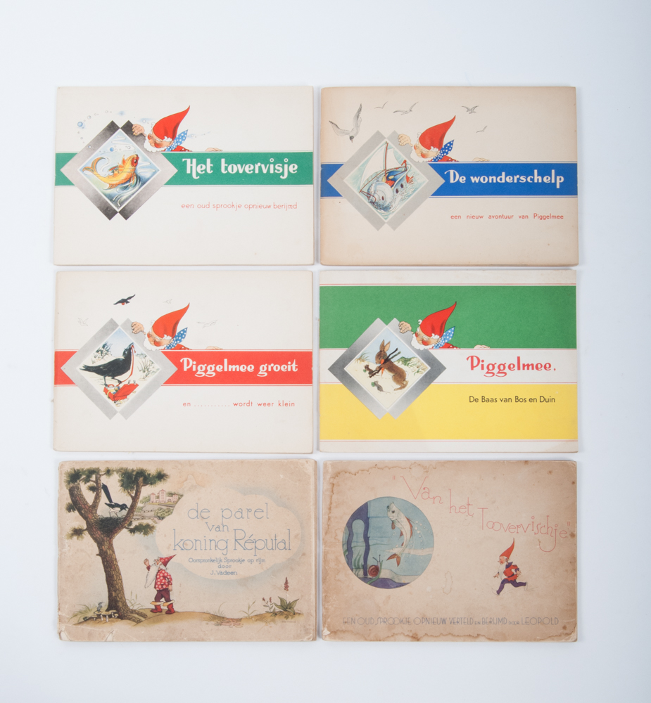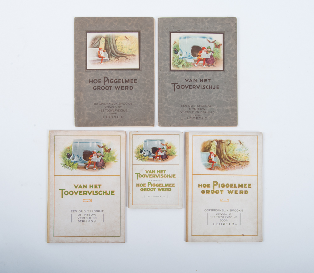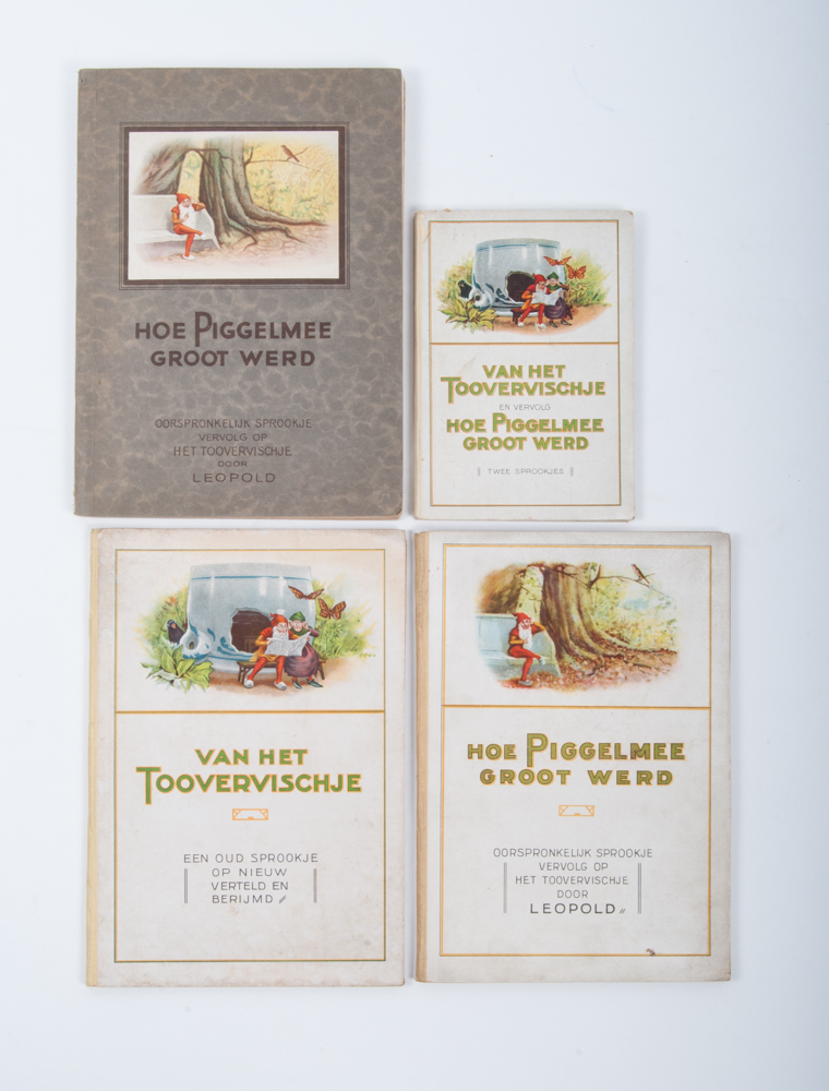 van het Toovervischje. H. Leopold. First edition 1920 + Hoe Piggelmee groot werd, first edition 1920 + the grey version in soft cover, 1923 + the small bundling of both, 1926 + van het Toovervischje, 1936, with fixed plates (sl. dampstained) + De parel van Koning Réputal, J. Vadeen, 1938 (sl. dam. cover) + the set Piggelmee in 4 vols. 1949-1951, illus. Nans van Leeuwen - and 10 other later editions.