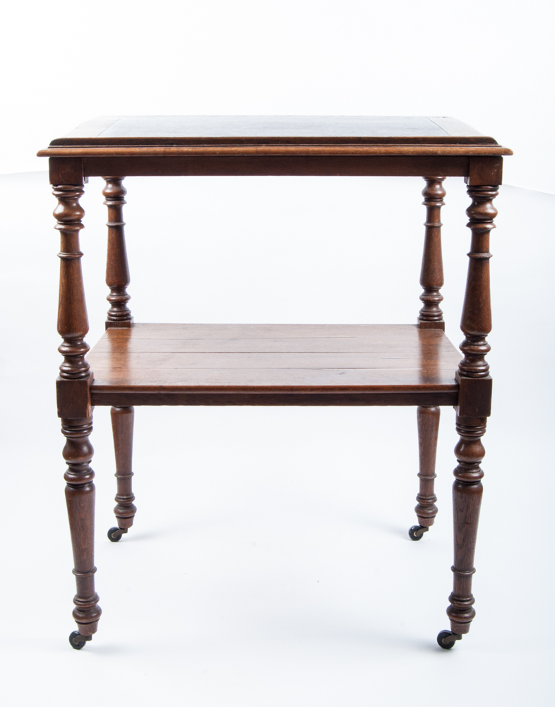 Oak library piece with sloping top inlaid with varnished cloth and right underneath the top a long, small drawer for writing materials, a second shelf between the twisted legs, on wheels, dimensions 90 x 72 x 54 cm. (minimal defects).