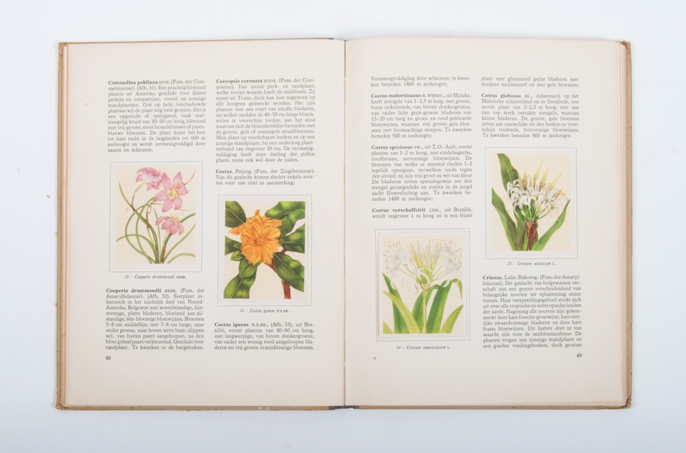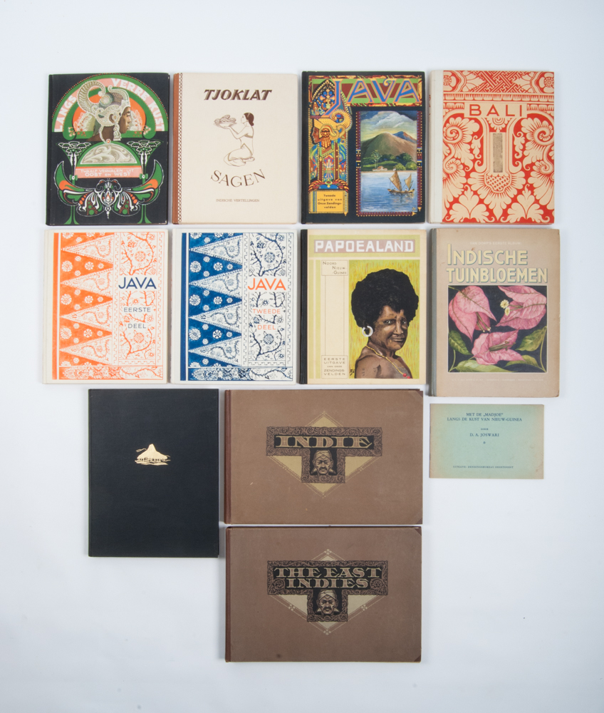 G.C.T. van Dorp & Co N.V., Semarang, Indische Tuinbloemen, 1940, complete with all pictures, fine copy + N.V. Droste's Cacao- en Chocoladefabrieken, Haarlem, Indi, 1928, complete with all pictures + the English edition of this copy, complete + 6 other albums about Indonesia + Stichting Mesoz, Gouda, Waar de velden wit zijn, 1952, complete with all 24 b/w photos and two others.