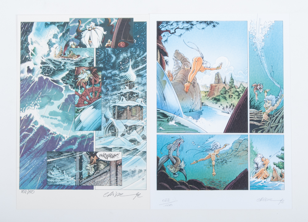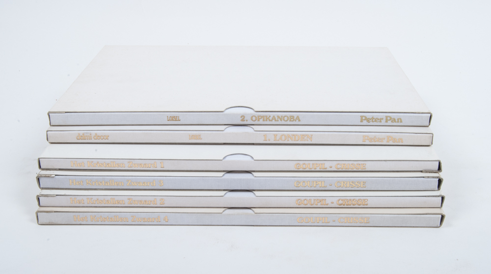 Peter Pan, vol. 1: London. Regis Loisel, Delmi Decor, Kortrijk, 1991. Deluxe numbered copy in white cloth with pasted front plate in slipcase with signed screen print. No. 96/100 + Peter Pan, vol. 2: Opikanoba, Oranje, Wielsbeke. Deluxe numbered copy in white cloth with pasted front plate with signed screen print. No. 39/225 + Het Kristallen Zwaard vol. 1-4. All in deluxe cloth with pasted front plate, printed in 150 copies with signed screen print and handwritten numbered preface.