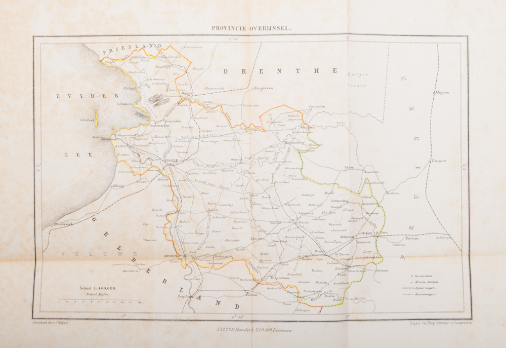 Oblong, half cloth, in original publisher's binding, front cover with title and illustration, back cover with advertisement, a few maps tender; with the provincial map of Overijssel and complete with 65 municipal maps, coloured in outline; these here and there with brown stains and finger stains, else good; sold w.a.f.
