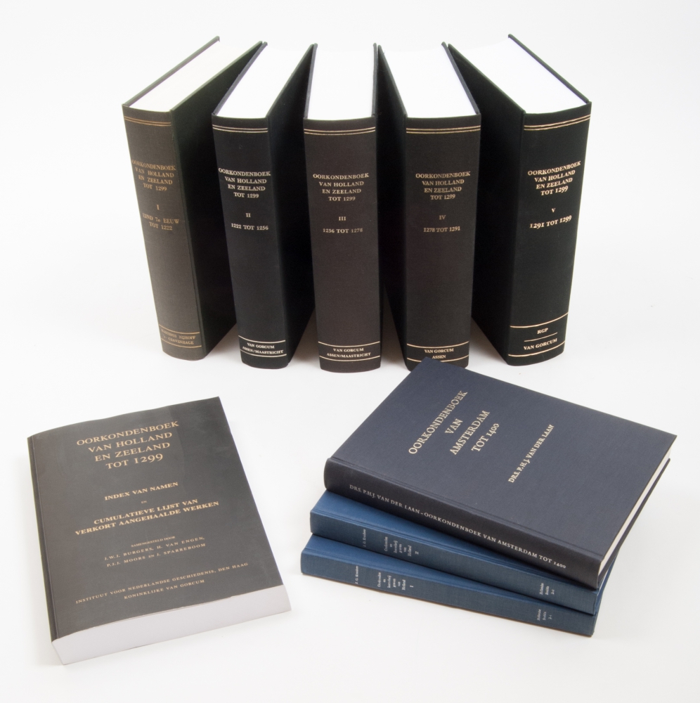 Added: Oorkondenboek van Amsterdam, Drs. P.H.J. van der Laan, N. Israel, Amsterdam, 1975 and De oorkonden en de kanselarij van de graven van Holland tot 1299, J.H. Kruisheer, Hollandse Studiën, 2-1/2 (2 vols.), Den Haag, Haarlem, 1971.