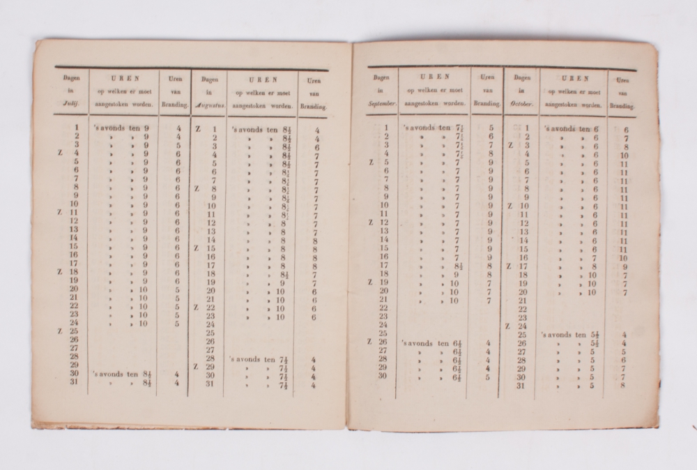 Extremely rare; Picarta lists 6 slightly earlier volumes in the Rijksmuseum. Detailed annual statement for those responsible for the Amsterdam street lighting. Each page lists two months with the days of each month, as well as the "Uren op welken er moet aangestoken worden" (of course, much earlier in winter than in summer) and the "Uren van branding" (in winter obviously much longer than in summer). Sundays are also listed, with a "Z" before the date.