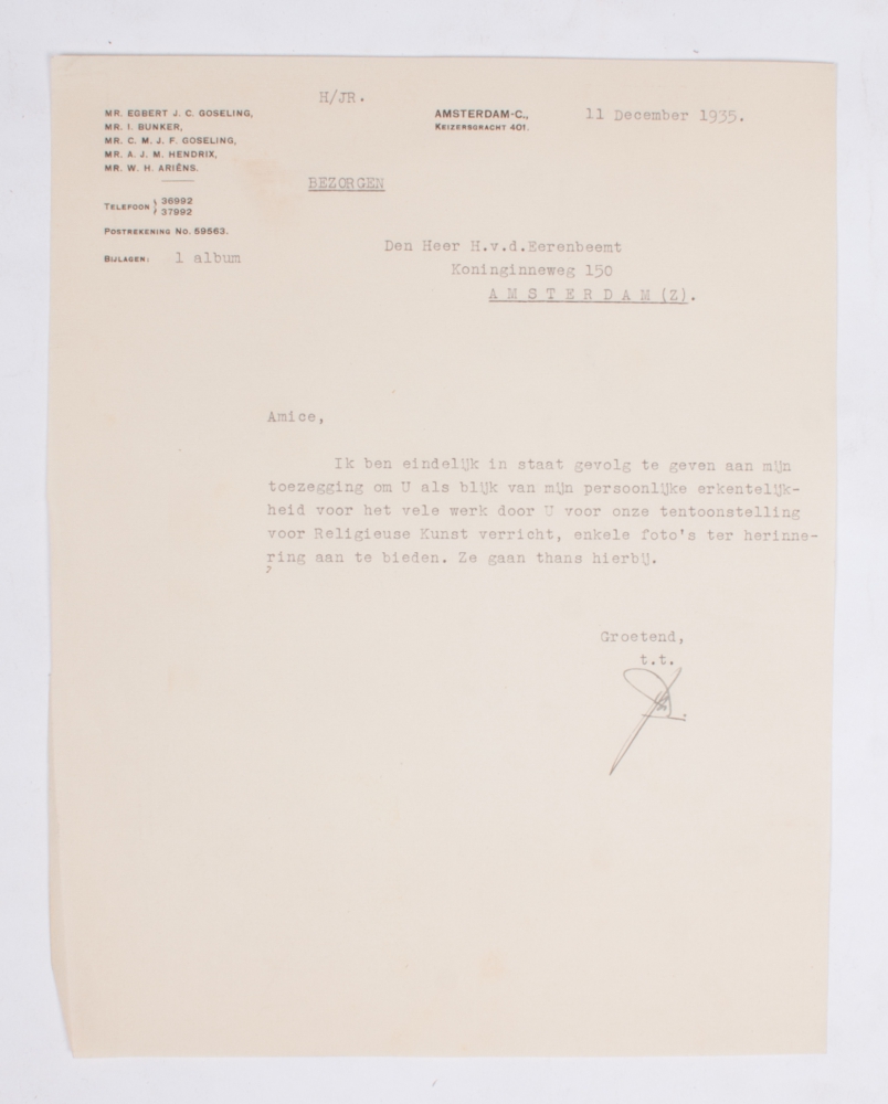 Thanks to an inlaid, typed sheet, the meaning of the album can be swiftly established. It concerns a letter, dated 11 December 1935, from one of the organisers of the exhibition to patron Herman van den Eerenbeemt: "Amice, ik ben eindelijk in staat gevolg te geven aan mijn toezegging om U als blijk van mijn persoonlijke erkentelijkheid voor het vele werk door U voor onze tentoonstelling voor Religieuse Kunst verricht, enkele foto's ter herinnering aan te bieden. Ze gaan thans hierbij. Groetend, t.t." [signed]. The letter is typed on stationery of the counsellors Goseling, Bunker, Hendrix and Ariëns in Amsterdam. An extensive description of Herman van den Eerenbeemt can be found in the introduction of his archive (Stadsarchief Amsterdam): https://stadsarchief.amsterdam.nl/archieven/archiefbank/overzicht/30600.nl.html.