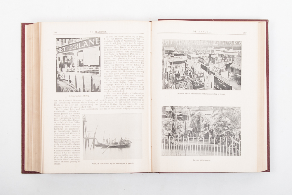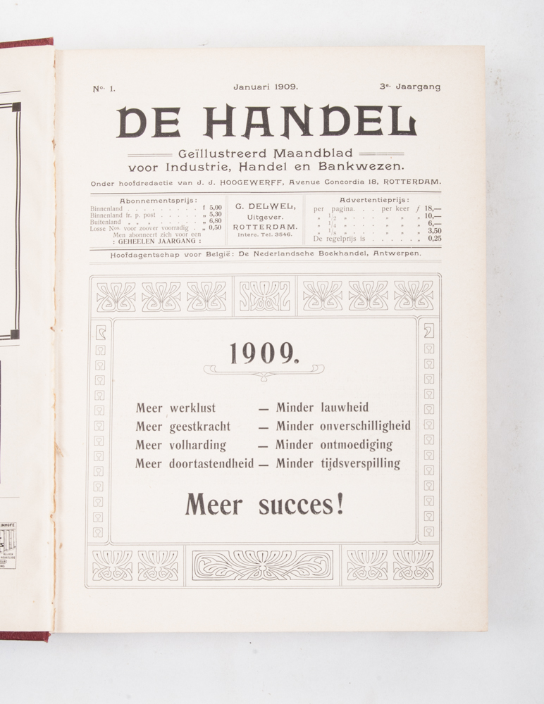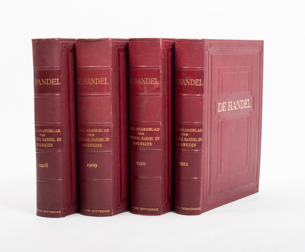 Maandblad voor Industrie, Handel en Bankwezen. Onder hoofdredactie van J.J. Hoogewerff. Second, third, fourth and sixth volume, 1908-10 and 1912. In fine red bindings with gilt stamping. Incl. articles on whaling, hair trade in China, diamond trade in Amsterdam, river toll etc.
