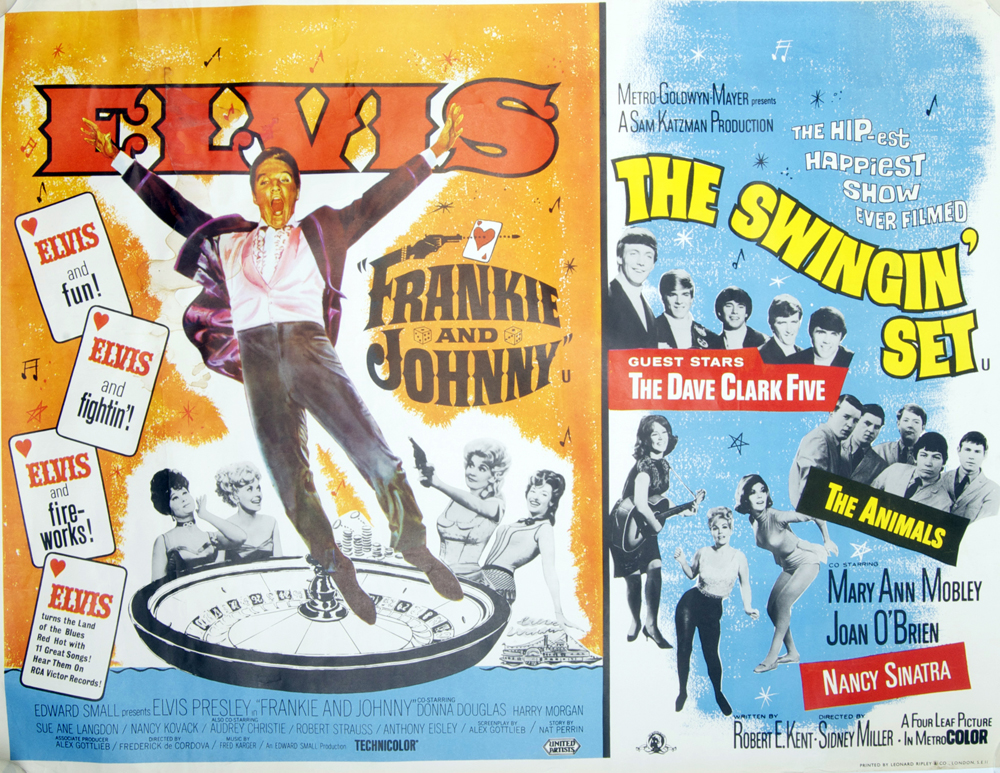 Elvis. Frankie and Johnny. Metro Goldwyn Mayer. Left-hand side image "The Swingin' set" Guest stars The Dave Clark Five, the Animas Nancy Sinatra et al. Leonard Ripley & Co, London, 1966. 75 x 100 cm.