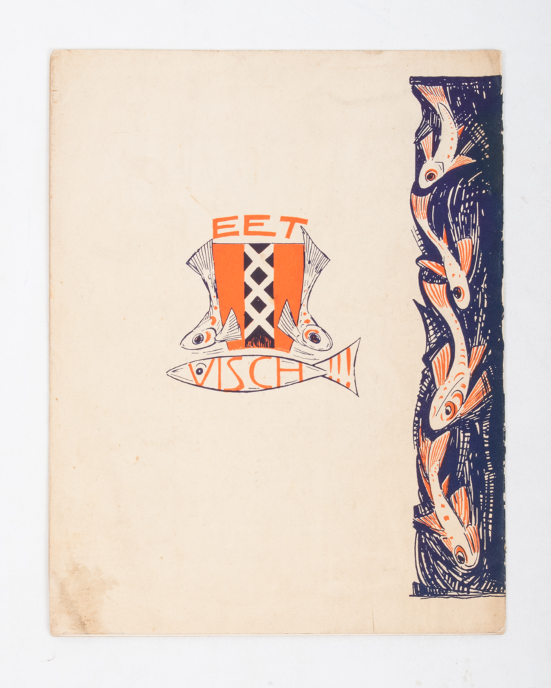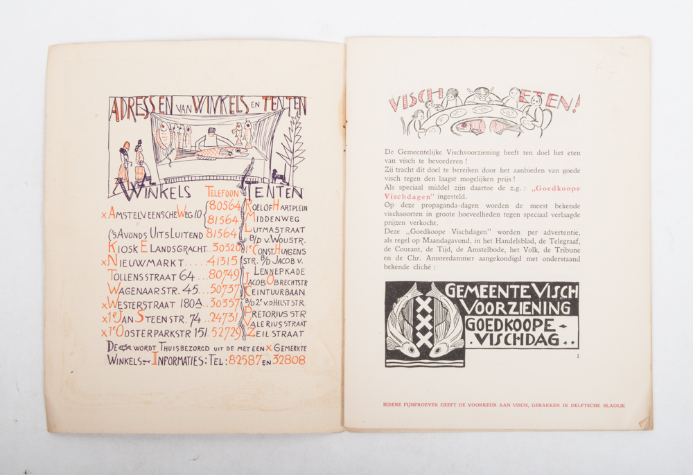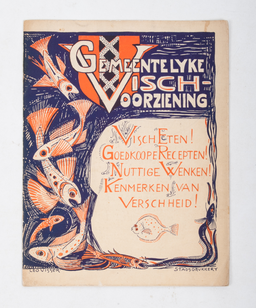 Visch Eten! Goedkoope Recepten! Nuttige Wenken! Kenmerken van Verschheid! Calcé, Amsterdam, ca. 1920. 16 pp. With cover litho Leo Visser + Het opruimen van Krotten en Krotwyken te Amsterdam. Staddrukkerij Amsterdam, 1929. Cover design Fré Cohen + Tentoonstelling Amsterdam oud en Nieuw georganiseerd door het genootschap Amstelodamum. 12 t/m 27 april 1924. 20 pp. Design Fré Cohen - and Giroboekje, verstrekt door het girokantoor der gemeente Amsterdam. Design Fré Cohen.