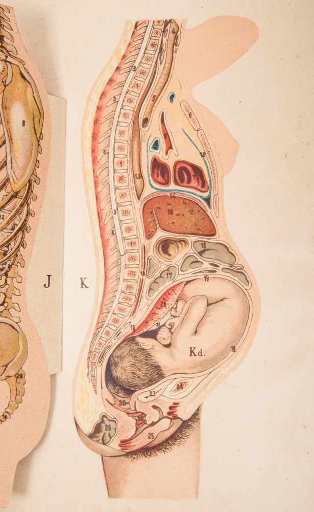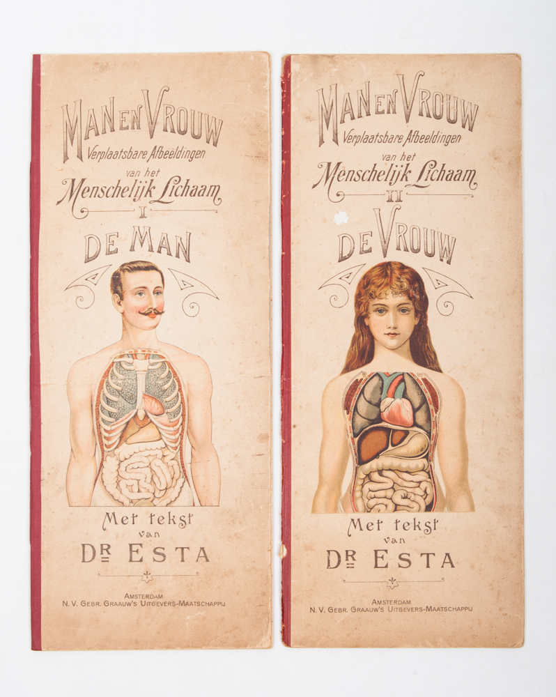 Man en Vrouw. Verplaatsbare Afbeeldingen van het Menschelijk Lichaam. I De Man. Met tekst van Dr. Esta. Amsterdam, N.V. Gebr. Graauw's Uitgevers-Maatschappij. Second ed., ca. 1900. 16 pp. with man foldable in VI parts, cont. 104 parts for indication. Elongated edition (height 49 cm.) with lithographed front cover and cloth spine. String-bound + De Vrouw, idem, but with 11 foldable parts and 450 parts for indication.