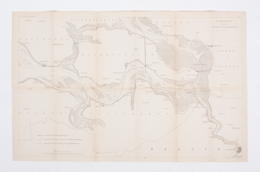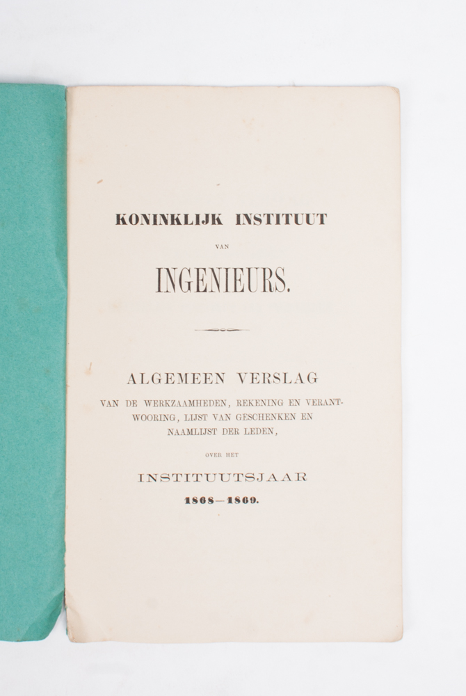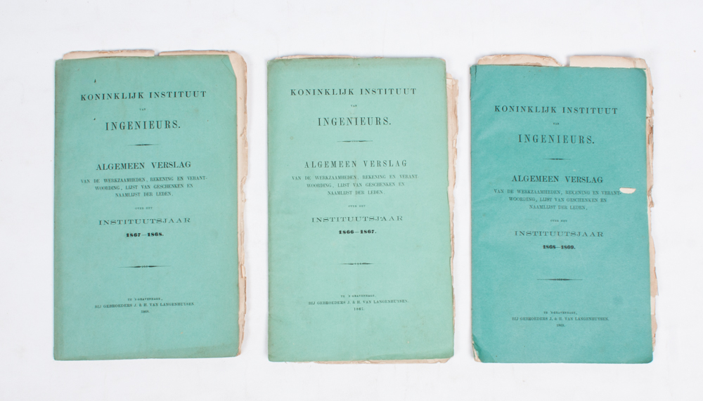 With: Notulen der Vergadering [of the Royal Institute of Engineers] van den 11den september 1866-10den junij 1869. Den Haag, no publisher (J. & H. van Langenhuysen), 1866-1869, 15 (of ...?) vols., with folding charts and lithographed plates, original uniform cover.