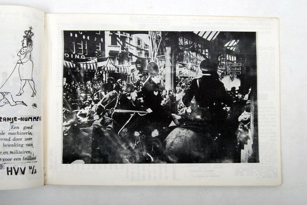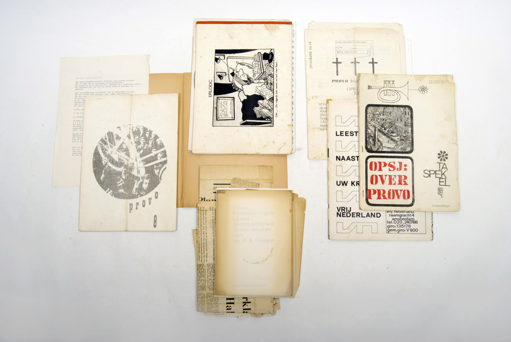 Provo-bulletin. "het Amsterdamse Provotariaat verklaart zich unaniem solidair met de eisen van de Amsterdamse Bouwvakarbeiders" + provokatie 14. "Provo blijft aktief in zijn Opruiing tot verstoring van die gezapige kristelijk-sosjaal demokratiese orde (..) make a love-war. Amsterdam, Easter 1966 + Provokatie no. 12 and 11 others - and a number of newspaper articles of the time.