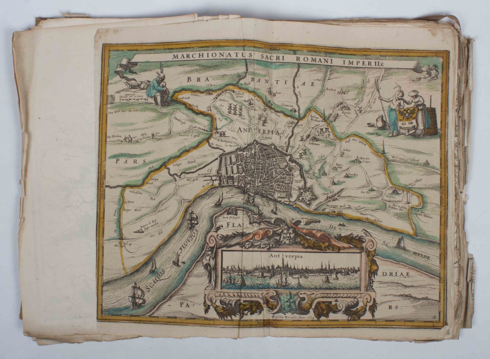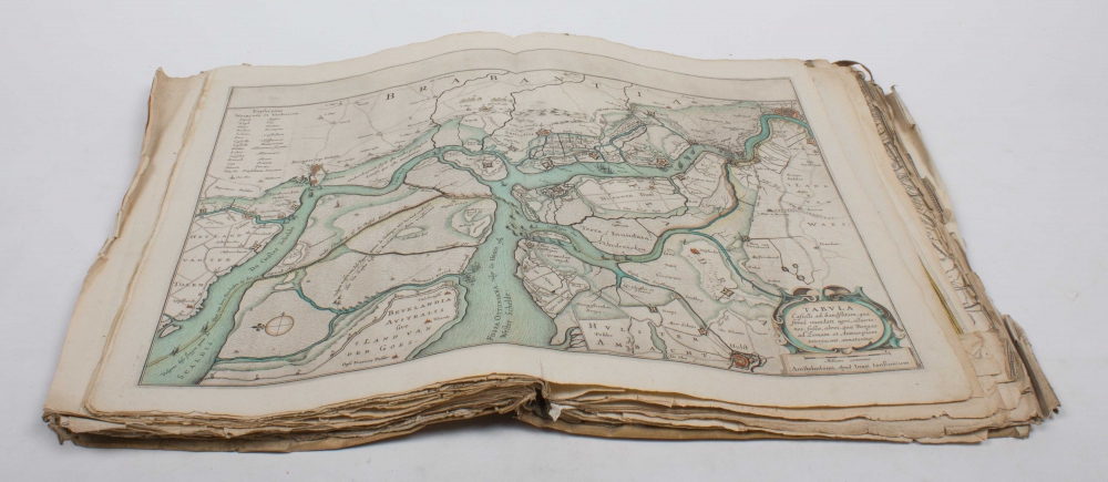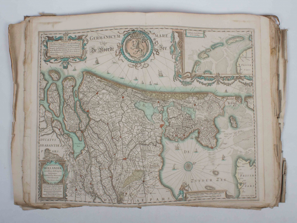 All other maps in the atlas have coloured outlines (folding maps with size): (8) Belgii Veteris Typus. Ex conatibus Geographicis Abrahami Ortelii (no address or date); (9) Comitatus Flandriae Nova Tabula (Amst., H. Hondius, n.d.; bottom margin cut short and frayed); (10) Pascaert vande Custe, van Vlaenderen, van Walcheren tot Calesen Bouloigne in Vranckrijc (Amst., H. Hondius, 1631) (folding: 43.5 x 51 cm.); (11); Description de la Vicompté de Bourbourg (Paris, J. Boisseau, 1644); (12) Flandria Gallica Continens Castellanias (...) (Amst., H. Hondius, n.d.); (13) (The area between Oudenaerde and Leuven, right-hand side connecting to the previous map), no address (Hondius); (14) Flandriae pars Occidentalis (Amst., H. Hondius, n.d.); (15); Flandriae pars Orientalis (Amst., H. Hondius, n.d.); (16) Artesia Comitatus. Artois, (Amst., J. Janssonius, n.d.); (17) L'Archevesche de Cambray (Amst., H. Hondius, n.d.); (18) Comitatum Hannoniae et Namurci descriptio (Amst., J. Janssonius, n.d.); (19) Namurcum Comitatus Auctore Iohann. Surhonio (no address); (20) Iuliacensis Ducatus (no address; cut short and frayed); (21) Iuliacensis et Montensis Ducatus. De Hertoghdomen Gulick en Berghe (no address); (23) Clivia Ducatus et Ravestein Dominium (no address); (30) Marchionatus Sacri Romani Imperii (C.J. Visscher, 1624); (31) Kaerte van Bergen Op Zoom, Steenbergen ende de Nieuwe Fortificatien gemaeckt tot bevrijdinghe van 't Landt van Ter Tolen in t jaar 1628 ("Visscher excudit"); (32) Tertia Pars Brabantiae (...) ex Archetypo Michaelis Florenty a Langren (no address; narrow margins); (33) Mechlinia Dominium et Aerschot Ducatus (...) (Amst., J. Janssonius, n.d.); (34) Brabantiae pars Septentrionalis (...) (Amst., H. Hondius, n.d., folding, 47 x 54 cm., folding part loose, margins left and right cut short); (35) Tabula Castelli ad Sandflitam (...) (Amst., J. Janssonius, n.d.); (36) Nieuwe Caerte waerinne vertoont wordt de gantsche Vaert van Amsterdam over de Watten tot de stadt Hamborch toe (H. Hondius, 1634, folding, 44.5 x 49.5 cm., narrow margins); (37) Zeelandia Comitatus (J. Janssonius, n.d.); (38) Novissima Delflandiae, Schielandiae et circumieacentium insularum (Amst., H. Hondius, 1629, folding, 45 x 54.5 cm., small holes in top left-hand corner); (39) Novissima Tabula Insular. Dordracensis, Alblasser, Crimper, Clundert etc. (Amst., H. Hondius, 1629, folding, 45 x 53.5 cm., cut short and frayed, dam. in bottom margin); (40) Comitatus Hollandiae novissima descriptio Designatore Balthazaro Florentio a Berckenrode Anno Domini 1629 (Amst, H. Hondius); (41) Episcop. Ultraiectinus (...) (Amst., H. Hondius, 1628, by Van Berckenrode); (42) Rhinolandiae, Amstelandiae (...) (Amst., H. Hondius, 1629, by Van Berckenrode, folding, 45 x 55 cm., left margin frayed); (43) (Part of North Holland from Amsterdam to Wieringen) (no address, folding 45 x 55 cm., damaged); (44) De Zype/ Beemster/ De Purmer/ De Wormer/ Caerte van Waterland (...) (Amsterdam, H. Hondius, n.d. 5 maps on one double-page leaf); (47) Fossa Eugeniana quae a Rheno ad Mosam duci coepta est, Anno mdcxxvii ductu Comitis Henrici van den Berge (Amst., H. Hondius, n.d.) ; (unnumbered) Illustribus Ac potentibus Drentiae (...) dedicat Cornelis Pijnacker 1634 (Amst., H. Hondius, n.d.); (unnumbered) Le comté de Flandre avec parties des Comtés de Hainaut et d'artois (Paris, Crépy, 1741, folding, 50.5 x 64 cm., damaged); (unnumbered) Le cercle de la Basse Saxe (...) (Paris, Crépy, 1757, folding, ca. 65 x 49 cm., damaged).