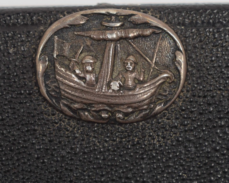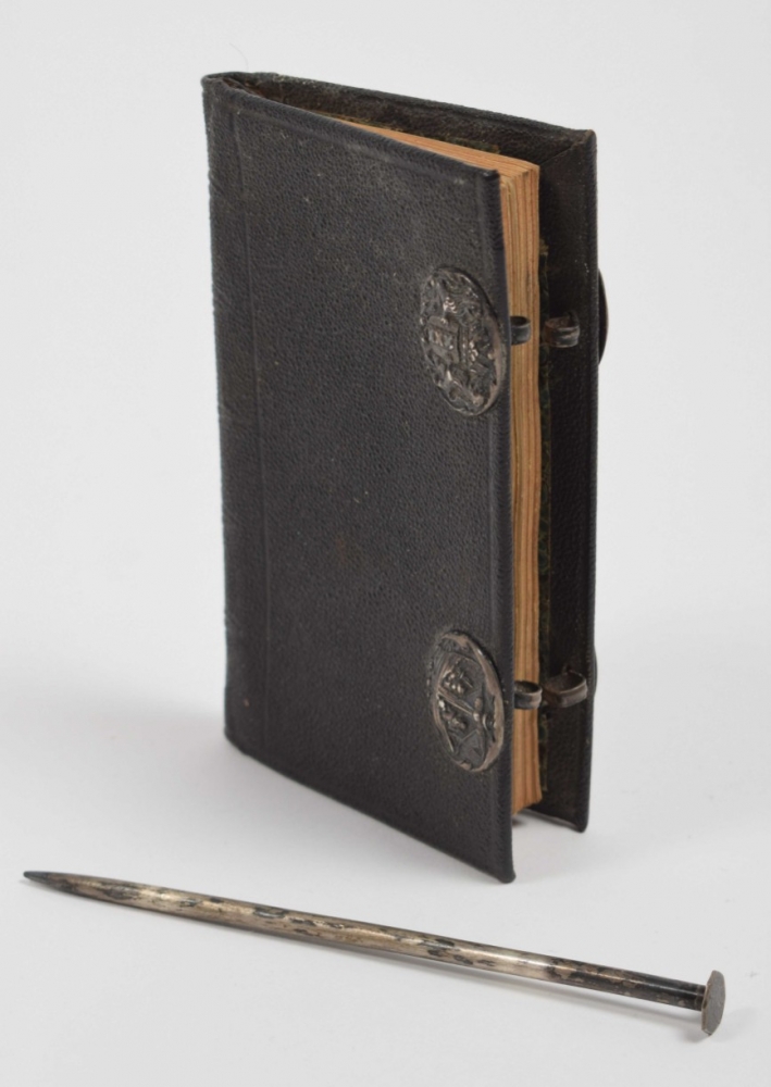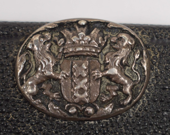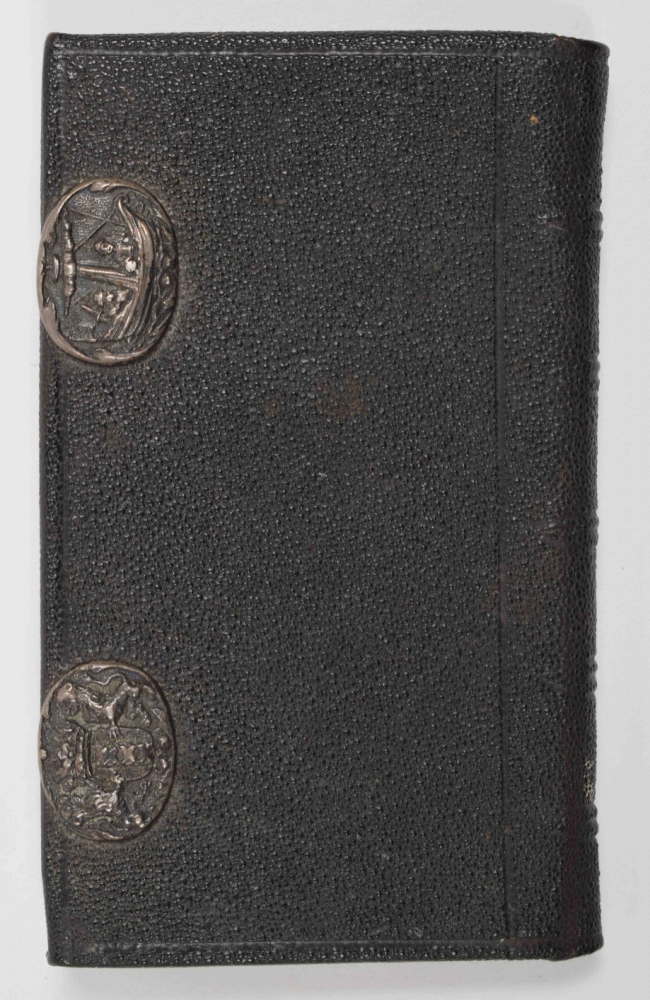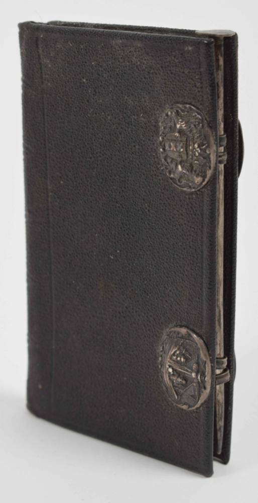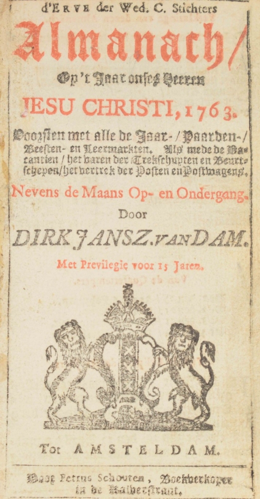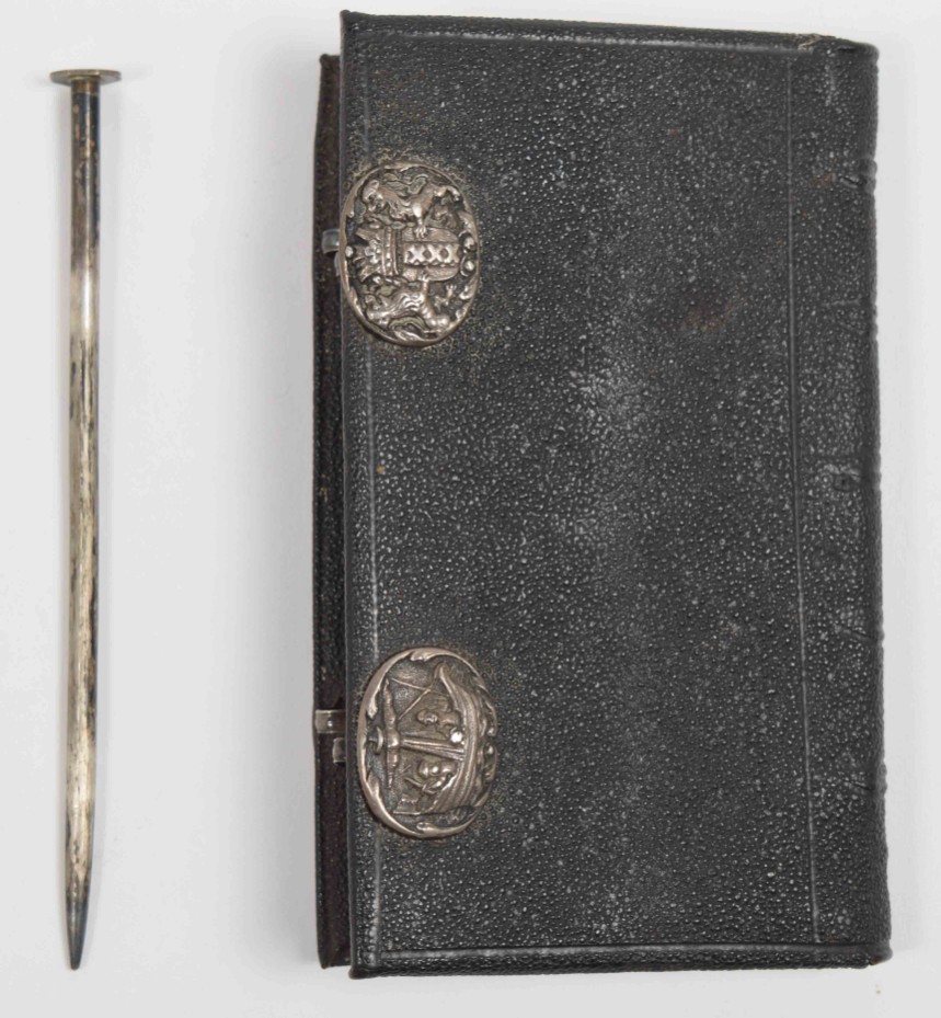 Jesu Christi, 1763. Voorsien met alle de jaar, paarden, beesten, en leer-markten (...) nevens de maans op- en ondergang. Dirk Jansz. van Dam. Amsterdam, Petrus Schouten. 23 pp. 18th-century black chagrin, with silver embossing depicting the coat of arms of Amsterdam and 2 sailors on a small ship, fore edge with rings through which the original silver pen can be placed to close the binding, 13.5 x 8.5 cm.