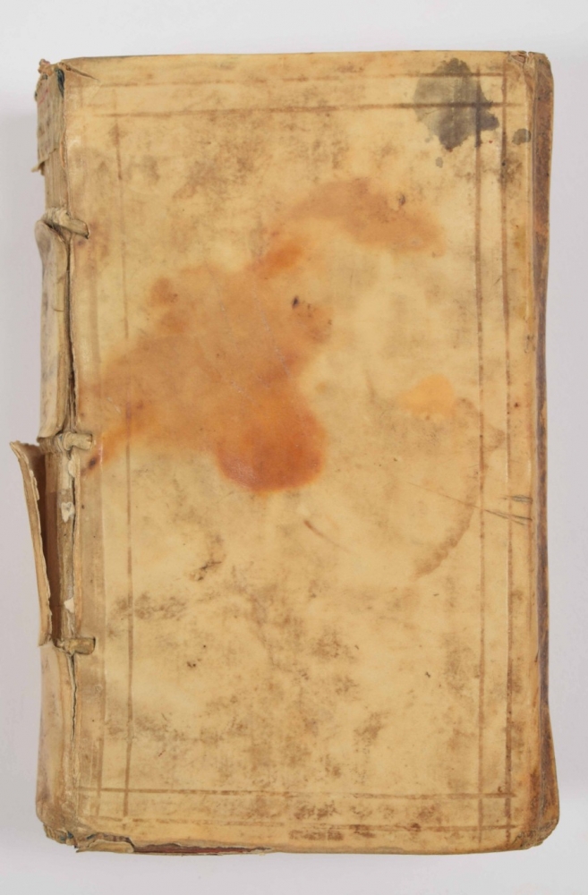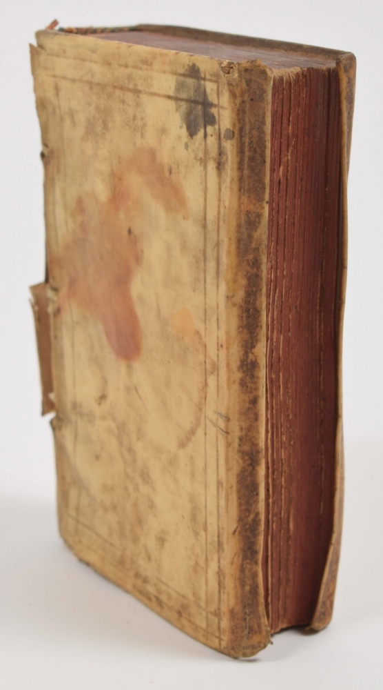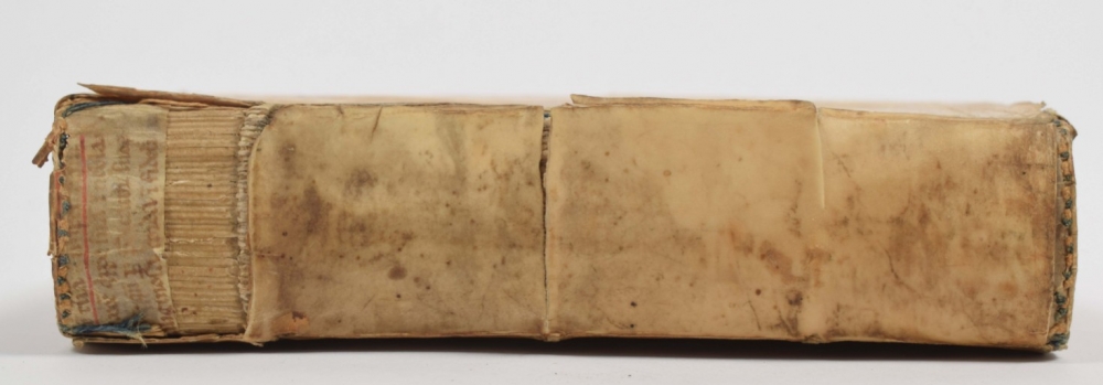 Bookplate of W.G. van der Tak on upper pastedown, title page sl. soiled and with stamp, scattered early ann. in margin, a few pp. sl. (water)stained. Vellum soiled, spine dam. and partly missing, showing medieval maculature.