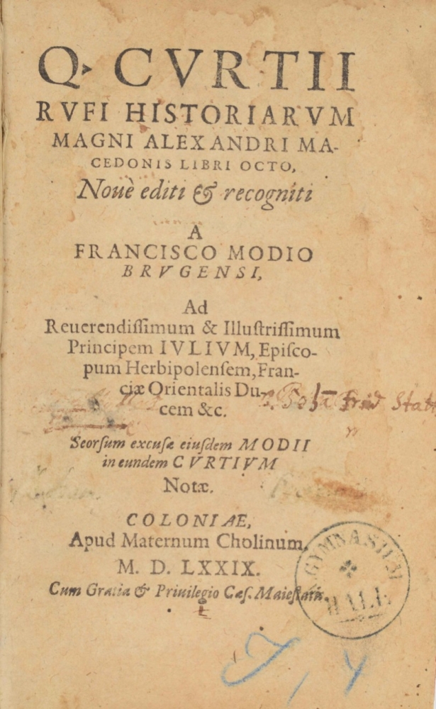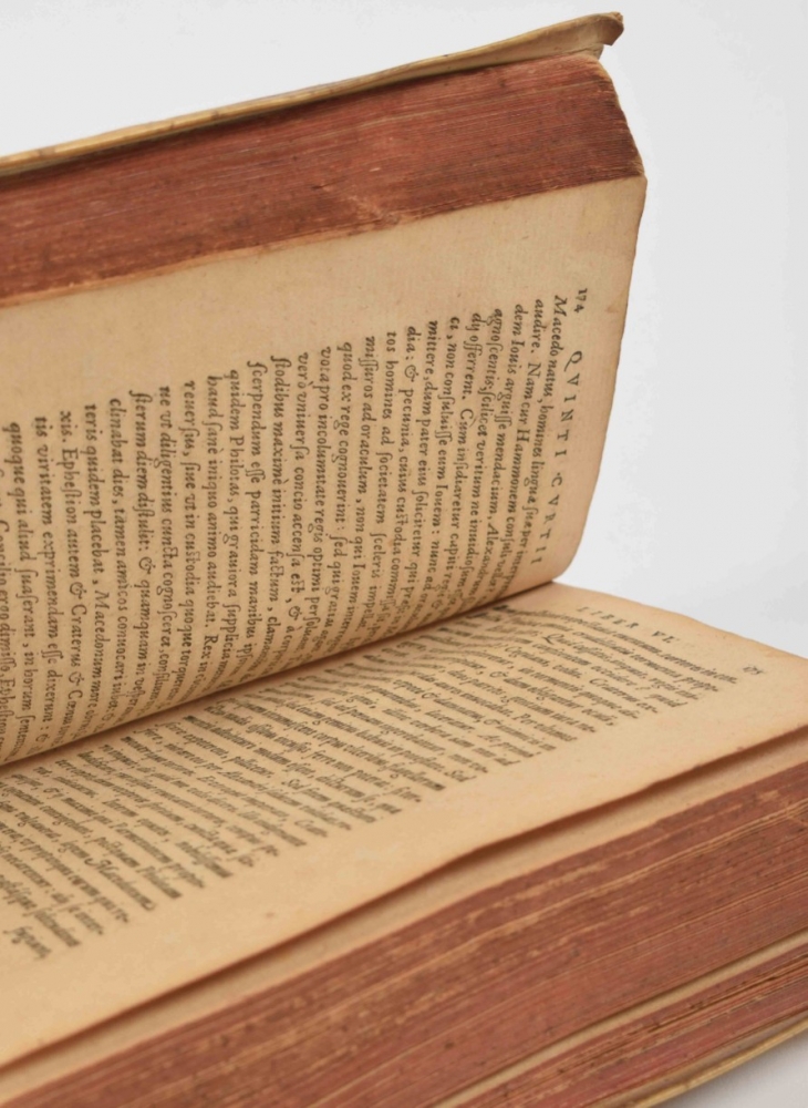 Libri octo. Quintus Curtius, Francisco Modio ed. Cologne, Maternum Cholinum, 1579. (14), 343, (16), 181 (2) pp. Woodcut initials. Overlapping vellum, 8vo.