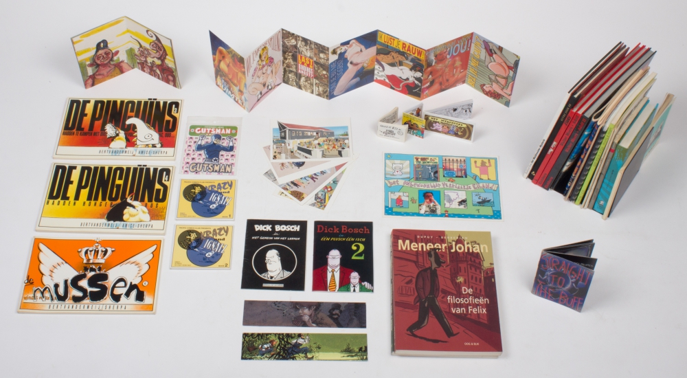 Highly diverse lot with e.g. Meneer Johan, De Pinguïns 1 to 4, Dick Bosch, Casanova's perfume, Adolf - Walter Moers, signed publications, picture postcards, bookmarks.