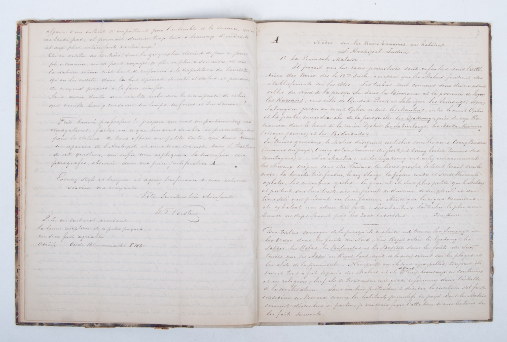 Very interesting manuscript concerning three leading figures in the field of ethnography and Indonesian natives. The letter to De Quatrefages covers leaves 1-6. De Quatrefages had asked Versteeg at a congress in 1870 for a French translation of articles by important colleagues which had not appeared in French. The manuscript is Versteeg's reply, with an explanation of the appendices in the extensive letter: A: Notes sur les races humaines qui habitent l'archipel indien, by W.F. Versteeg himself (leaf 7-24 and own paging 1-36); B: Idées sur la population Alfoere, by Lüdeking (leaf 25-26, 3 pages); C: Quelques notices sur les tribus et les races humaines de Sumatra, by Dr. C. Swaving (leaf 27-34 and own paging 1-16); D: Alforas (…) peuple qui habite l'intérieur des grandes îles de la mer Moluques, by John Crawfurd (leaf 35-36, 4 pages); E. Plate index in pen (1 page) and 7 lithographed plates and a drawing in pencil of the mythical figure Orang Kubu.