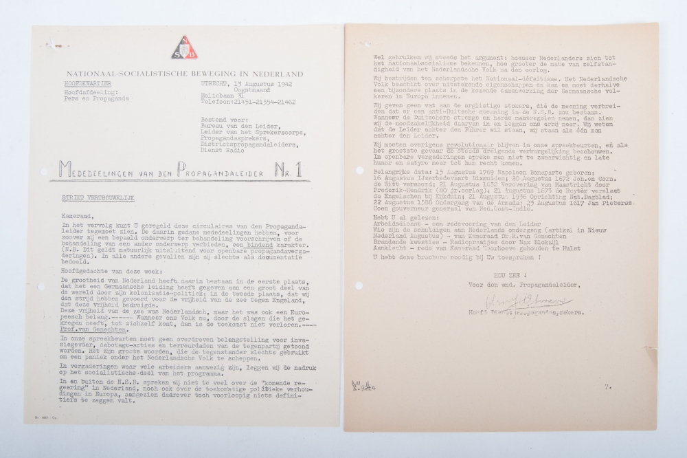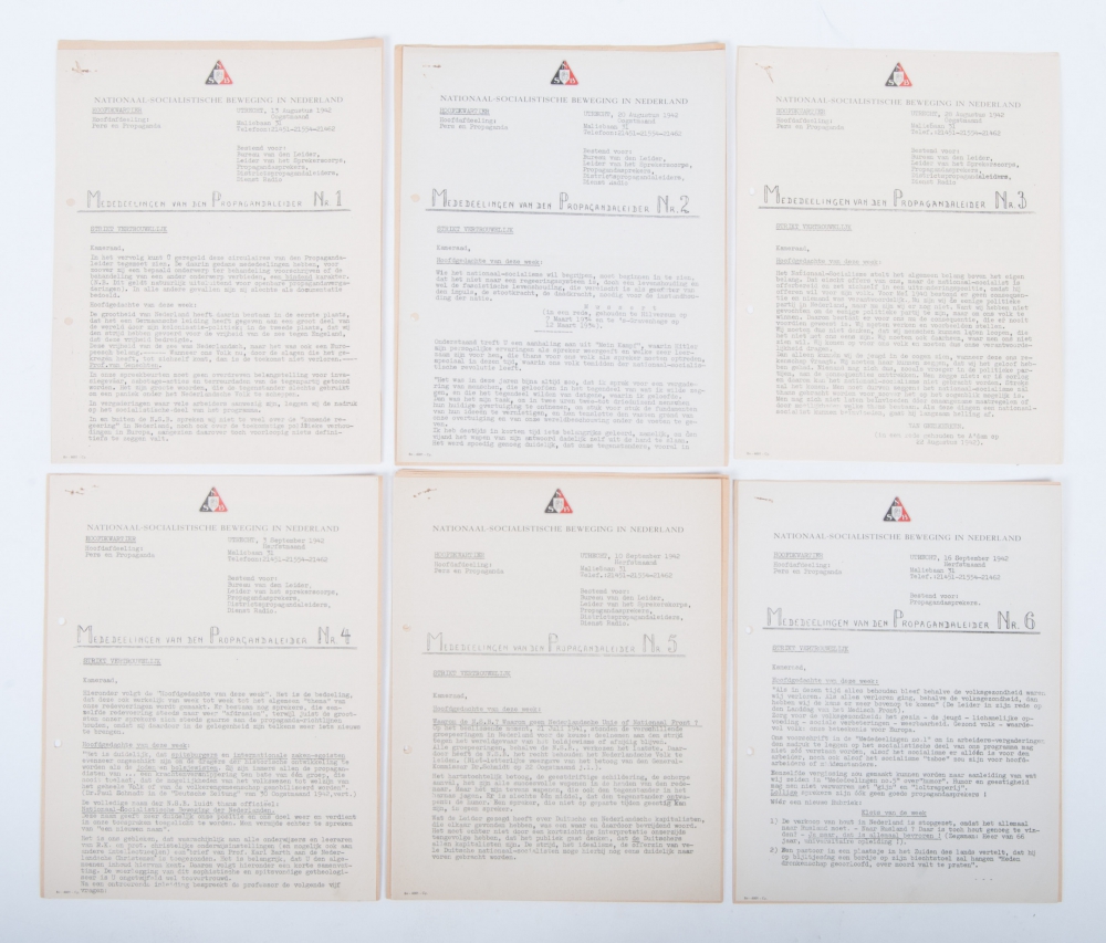 No. 1-17, 19, 23, 24 and 26-28. Typoscript stenciled publications by the Nationaal-Socialistische Beweging in Nederland, Maliebaan 31 in Utrecht, Hoofdkwartier, Hoofdafdeeling: Pers en Propaganda, published from 13 August 1942 to 5 March 1943, consisting of 1 to 2 leaves (No. 5 slightly more extensive), all with indication "strikt vertrouwelijk" (staples removed, perforated in left-hand margin).
