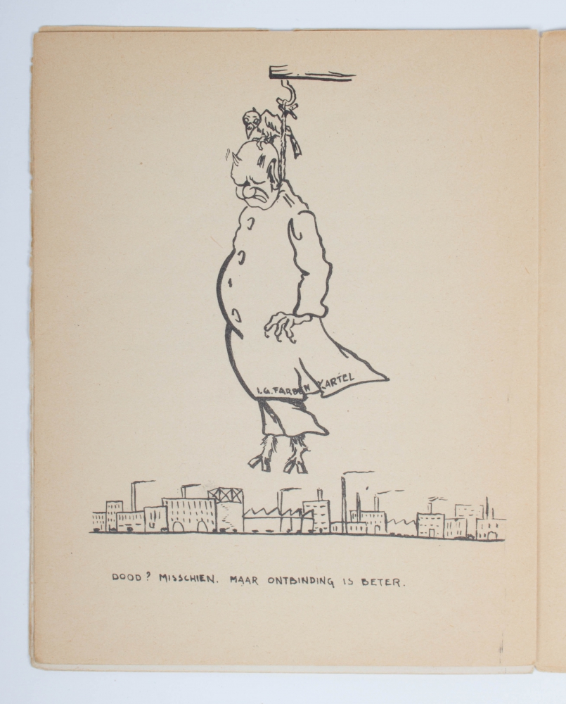 With: Auschwitz Buchenwald Natzweiler Bayer Höchst Behring Agfa. Typoscript publication, anonymous and lacks place, publisher and date (1951), (20) p. (incl. cover), with 7 caricatural illustrations, 21.5 x 17 cm., loose-leafed as published (torn on spine; very rare, only one copy in PiCarta).
