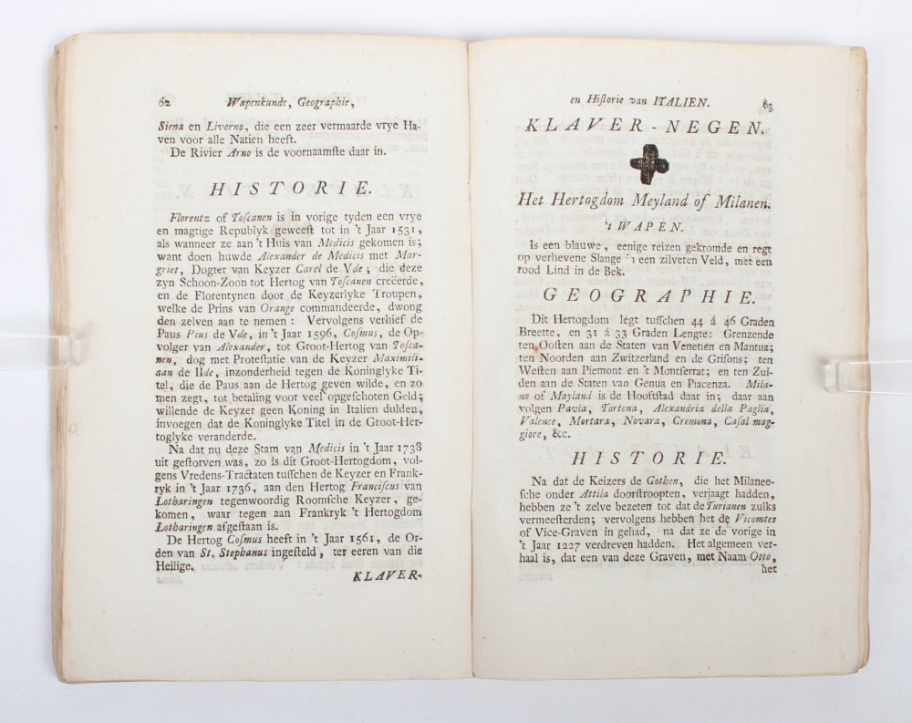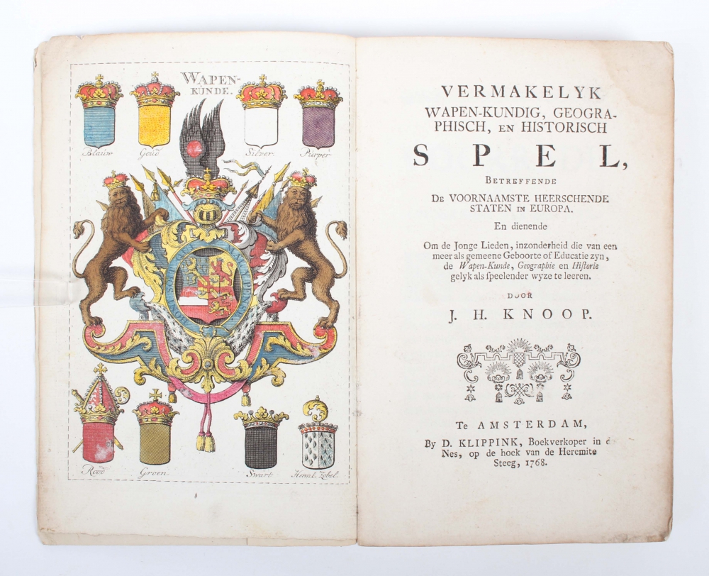 Vermakelyk wapen-kundig, geographisch, en historisch spel, betreffende de voornaamste heerschende staten in Europa. Amsterdam, D. Klippink, 1768. 8vo. [24], 203, [5] pp. With engraved, hand-coloured heraldic frontispiece. Cardboard, marbled binding. A few pages with marginal water stain, binding somewh. worn, else very good copy.