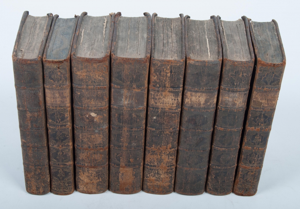 8vo, leather, 8 volumes (non-consecutive) from this series. More than 3500 pp. of text and a total of 47 folding copperplates. Bindings rubbed and with light damage. Plates in very good condition. Sold w.a.f.