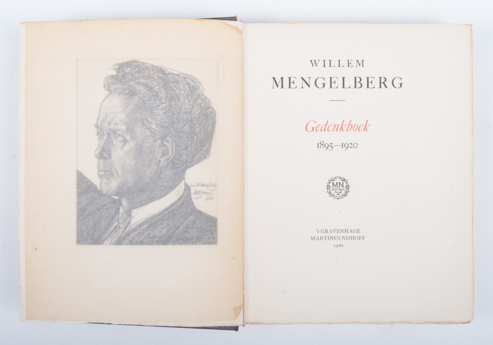 Gedenkboek 1895-1920. 's Gravenhage, Martinus Nijhoff, 1920. xiv, 290 pp. With extensive dedication drenched in affection by Mengelberg to Greta Wiesler on the title page.