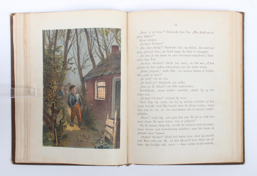 Alkmaar, P. Kluitman, [1891]. [2], 138, [2] pp. Contemporary brown cloth binding. With 5 chromolithographic plates (including 1 double). Poor copy. Corners and spine damaged, spine restored, new endpapers, title page affixed to end paper with interior margin and damaged, name stamp, first lithograph and first text leaf practically loose, first leaves reinforced along interior margin, on page 42 several annotations in a child's hand.