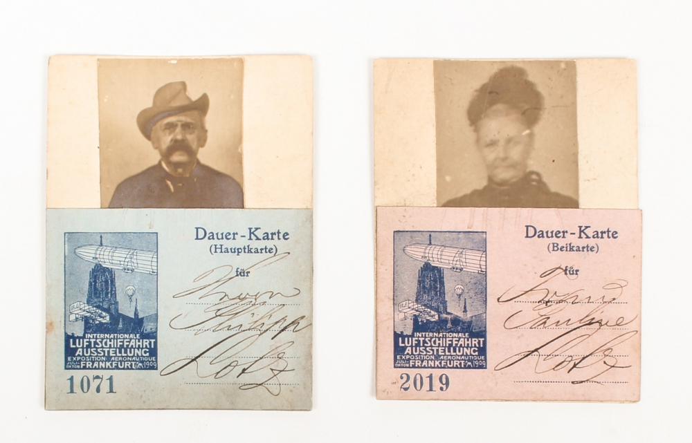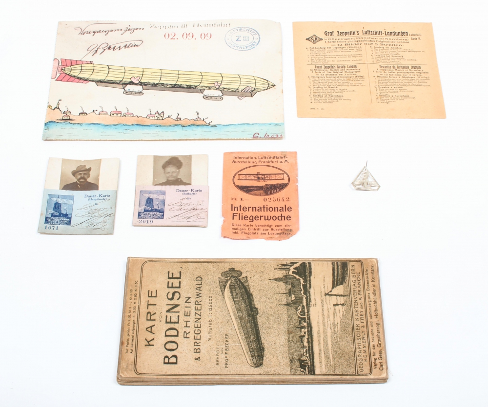 2 Dauer-Karten for the international Luftschiffahrt Ausstellung Frankfurt, 1909 + an admittance ticket for one day + a pin + an original drawing of a Zeppelin with stamp Luftschiff ZIII Signalpost 02-09-09. Added: Karte von Bodensee Rhein & Bregenzerwald, with on front a Zeppelin.