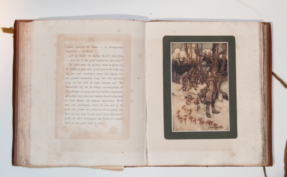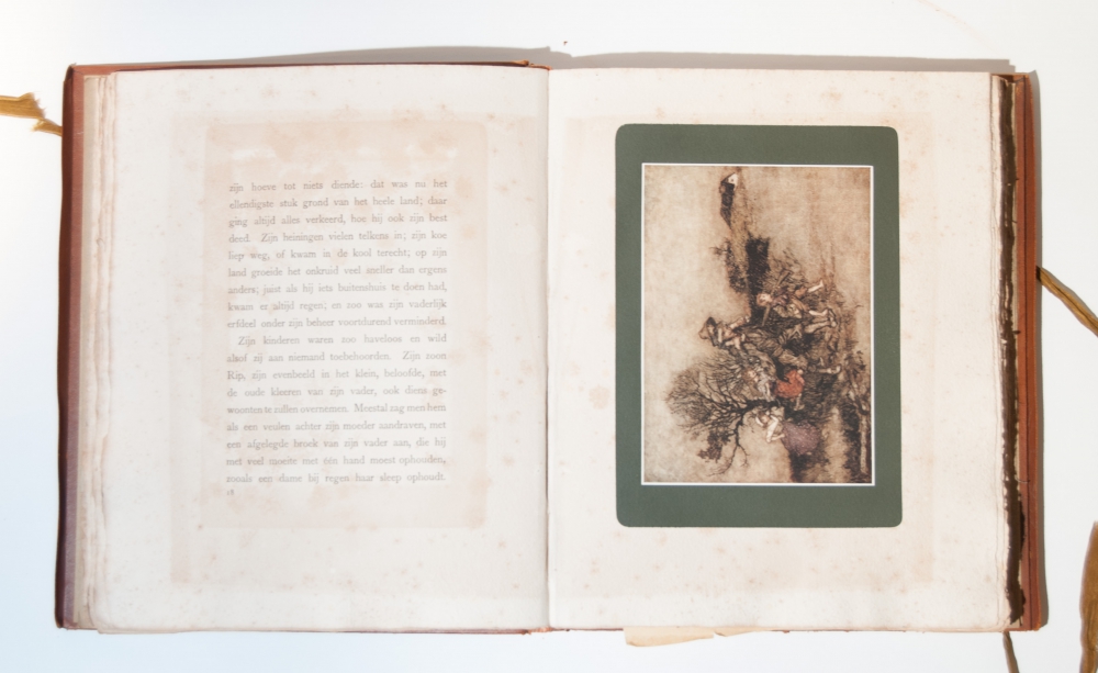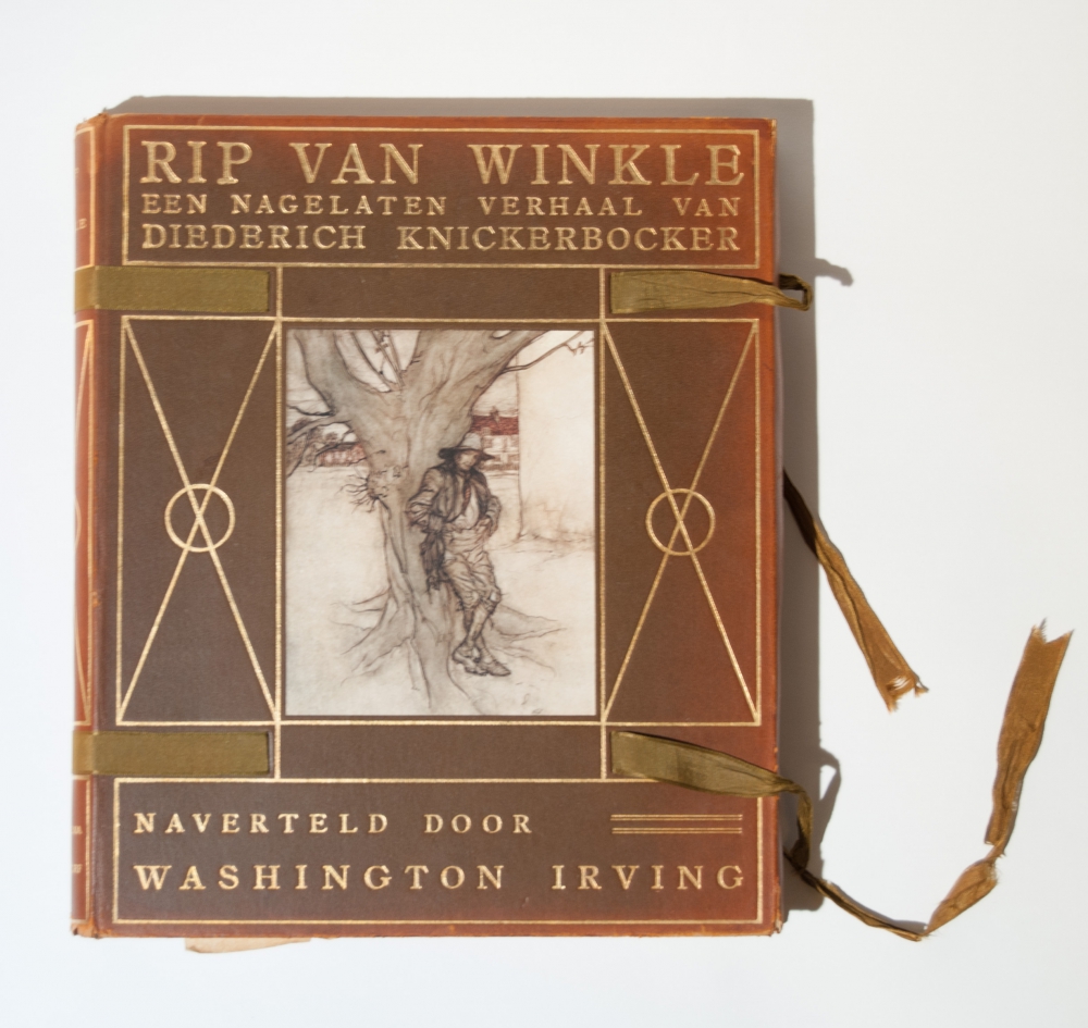 Washington Irving. Amsterdam, van Holkema & Warendorf, 1906. 97 pp. Folio, bound in calf with tipped-in front plate, gilt lettering and binding decoration. No. 208 of 325 copies. With 50 tipped-in plates by Arthur Rackham. Fine copy, with ties still around the spine and only light damage to extremities. Spine slightly worn along top and bottom, else neat copy.