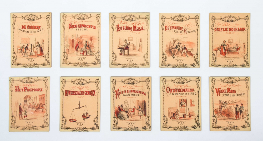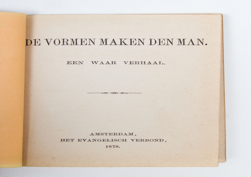 De vormen maken den man. Het Evangelisch Verbond, Amsterdam, 1878. 16 pp. 8vo + Het blinde Meisje + De vermoeide kleine Reiziger + Grietje Bolkamp + Het Paspoort + In weegschalen gewogen + Hoe een gelukkigen dag door te brengen + Ontevredenheid of Aanzienlijk en gering + Ware moed, of wat is een lafaard? - and Een gewichtig bezoek.