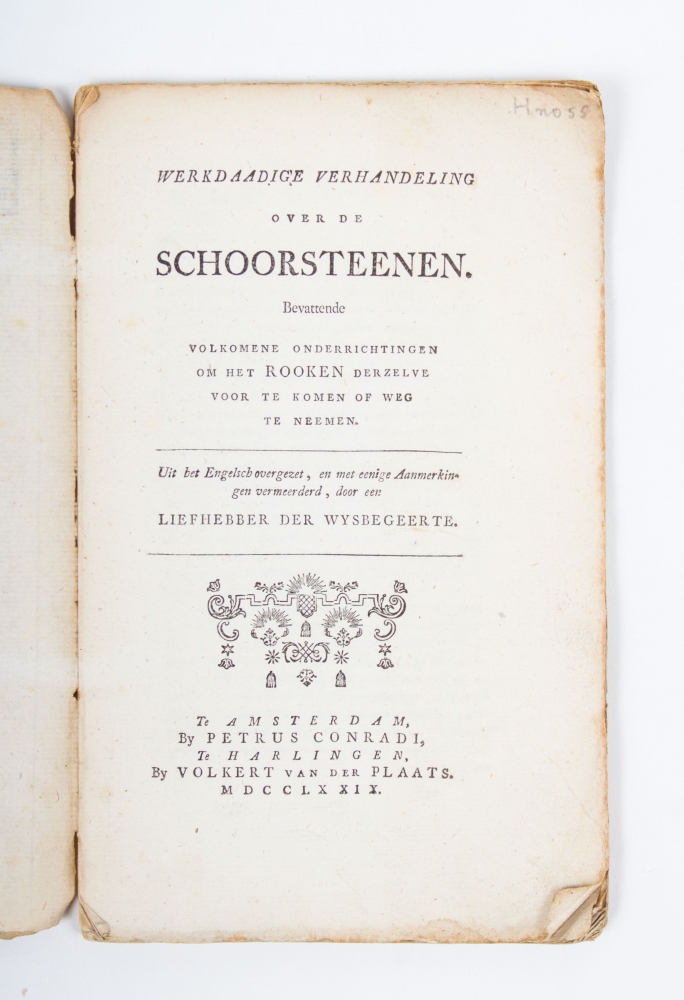 (J. Anderson). Bevattende volkomene onderrichtingen om het rooken derzelve voor te komen of weg te neemen. Uit het Engelsch overgezet, en met eenige aanmerkingen vermeerderd, door een liefhebber der wysbegeerte. Amsterdam/Harlingen, P. Conradi/V. v.d. Plaats, 1779. (2), ii, 67, (1) p. With 1 folding plate.