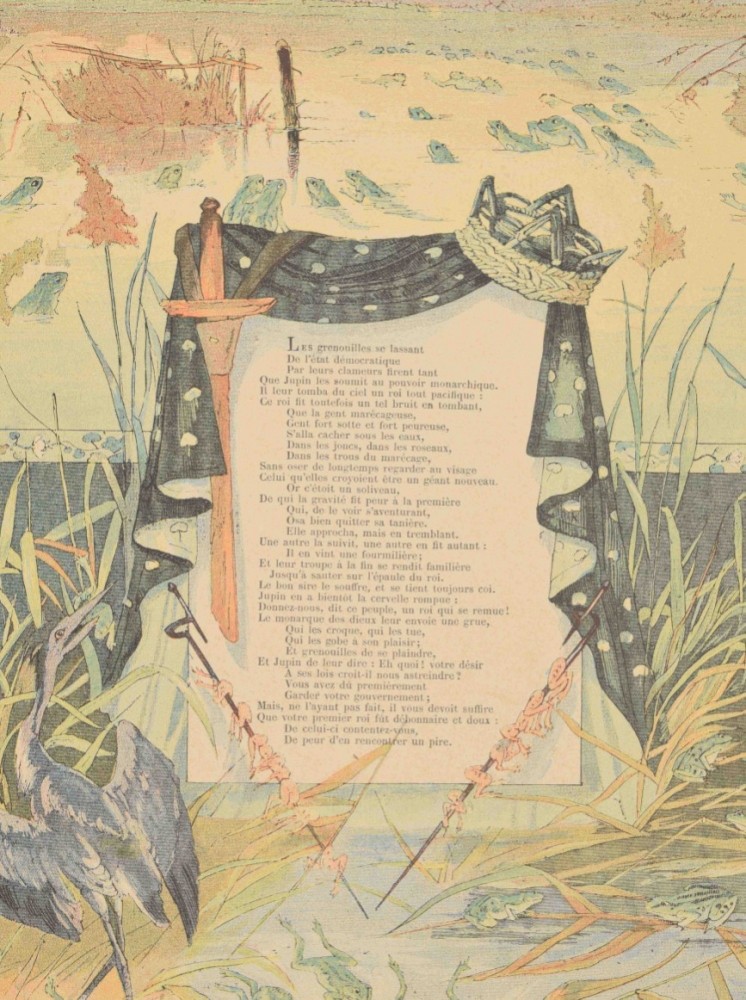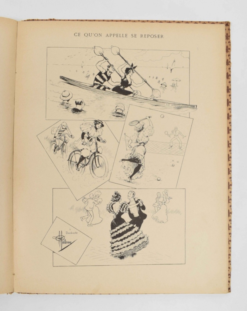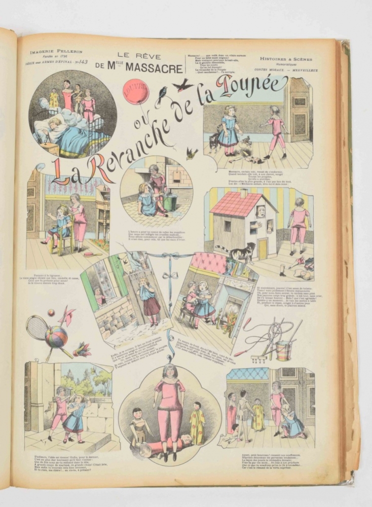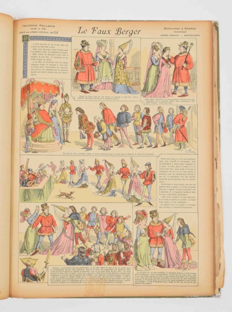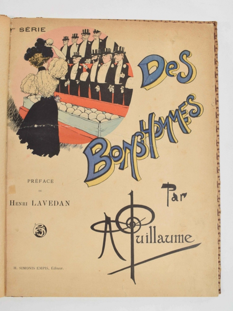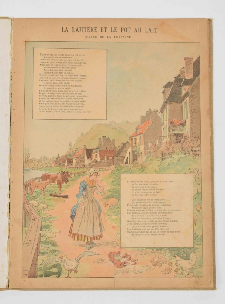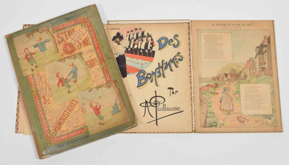 Histoires & Scenes Humoristiques. Contes moraux et merveilleux. Paris, A. Capendu, c. 1880. 100 coloured catchpenny prints by Pellegrin. Ills. boards with dust jacket, folio. 7 loosely inserted prints at the end. Index p. with stamp and restored tear, sl. edgeworn + Des Bonshommes. Albert Guillaume. 24 caricature prints. Decorated paper covers, 36 x 28 cm. Bookplate on upper pastedown, title page with tear restored on verso + 18 coloured prints of the fables of Jean de la Fontaine, such as "Le rat de ville et le rat des champs", "Le renard et le corbeau", "L'huitre et les plaideurs" and others. Reinforced with cloth. Bound in cloth, folio.