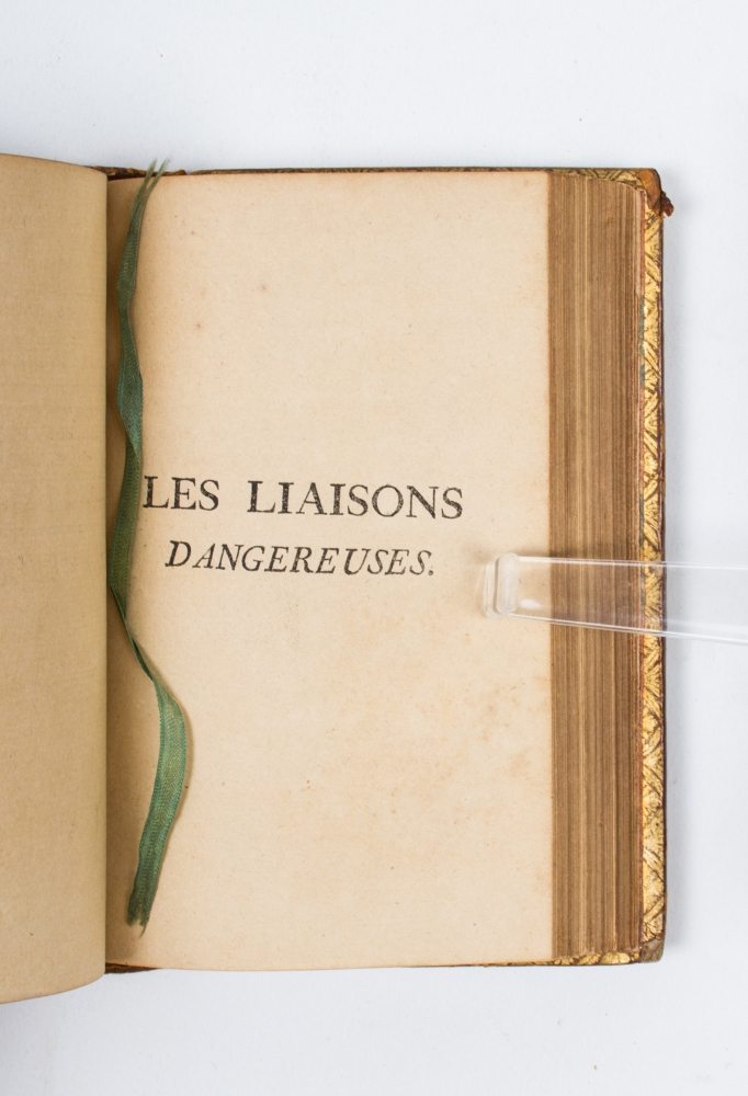 Despite (thanks to?) the fact that this epistolary novel on temptation, revenge and human ruthlessness was immediately banned, it would become one of the most successful books from the 18th century, of which during the year of the original edition, 1782, alone appeared 16 editions! Of these, ours, according to the bibliographer Max Brun, is edition "G". Each volume has its own half title. Known to general audiences mostly thanks to the 1988 film Dangerous Liaisons.