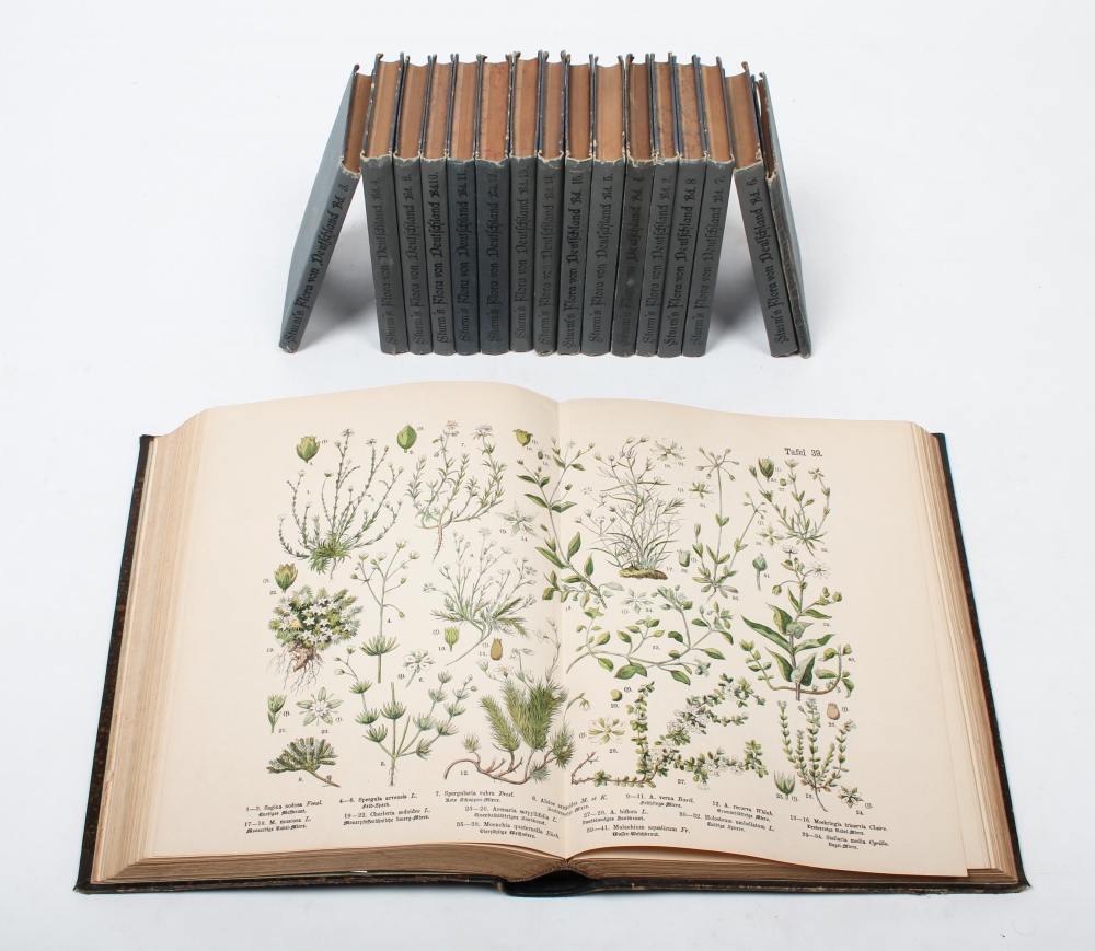 (2). J. Sturms Flora von Deutschland. 1. Abteilung. Phanerogamen [everything from this edition]. Zweite, Umgearbeitete Auflage. Stuttgart, K.G. Lutz, 1900-1907, 16 volumes (incl. 2 registers), with 832 chromolithographic plates and 56 monochrome lithographed plates, original uniform half cloth, small 8vo (minimal defects). Near-complete set, including the very rare second supplement but lacking the "Excursionsflora", published in the series Schriften des Deutschen Leherer-Vereins für Naturkunde. The first edition appeared from 1798 to 1855 (total 2 works in 17 volumes).