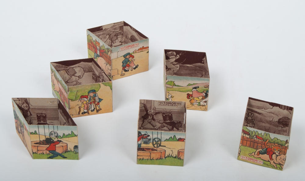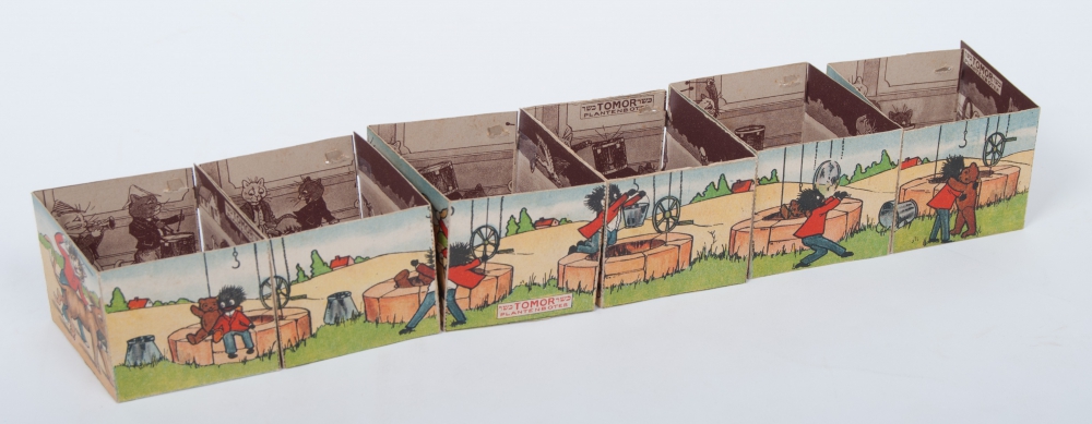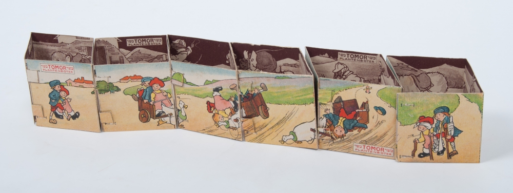 ca. 1920. 6 x 4 stories consisting of a strip, on verso ditto in brown/ white. By affixing the strip with 2 lids, a square emerges. All 6 squares in a row form stories. Thus with a total of 6 x 4 x 2 stories.