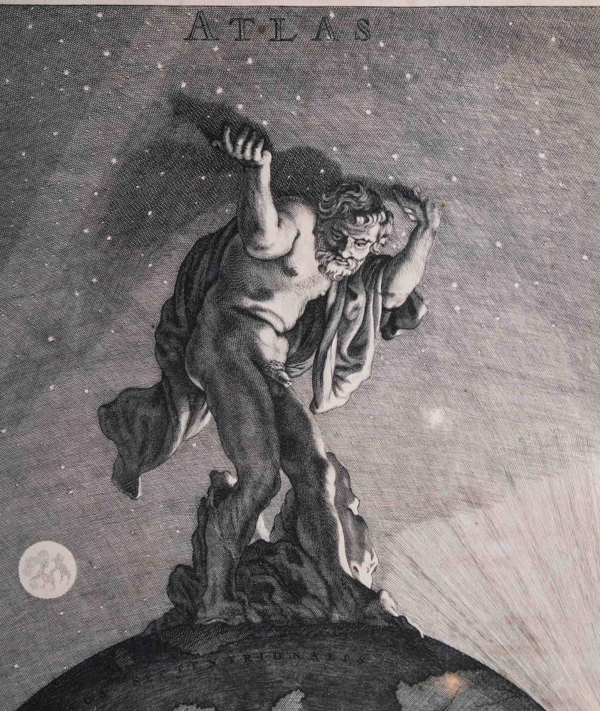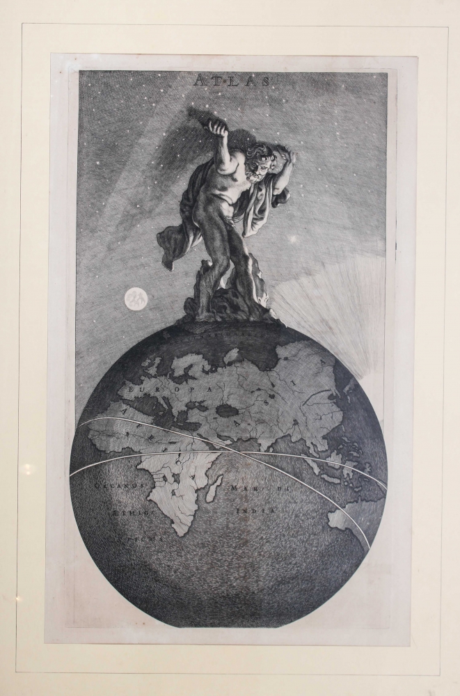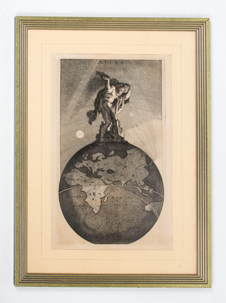 Engraved frontispiece for an Atlas by Frederik de Wit, ca. 1680, 43.5 x 25 cm., mounted in frame.