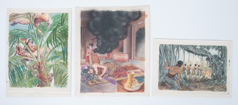 Three original watercolours from the picture album Tjoklat Sagen, 1937. Each ca. 39 x 26 cm.