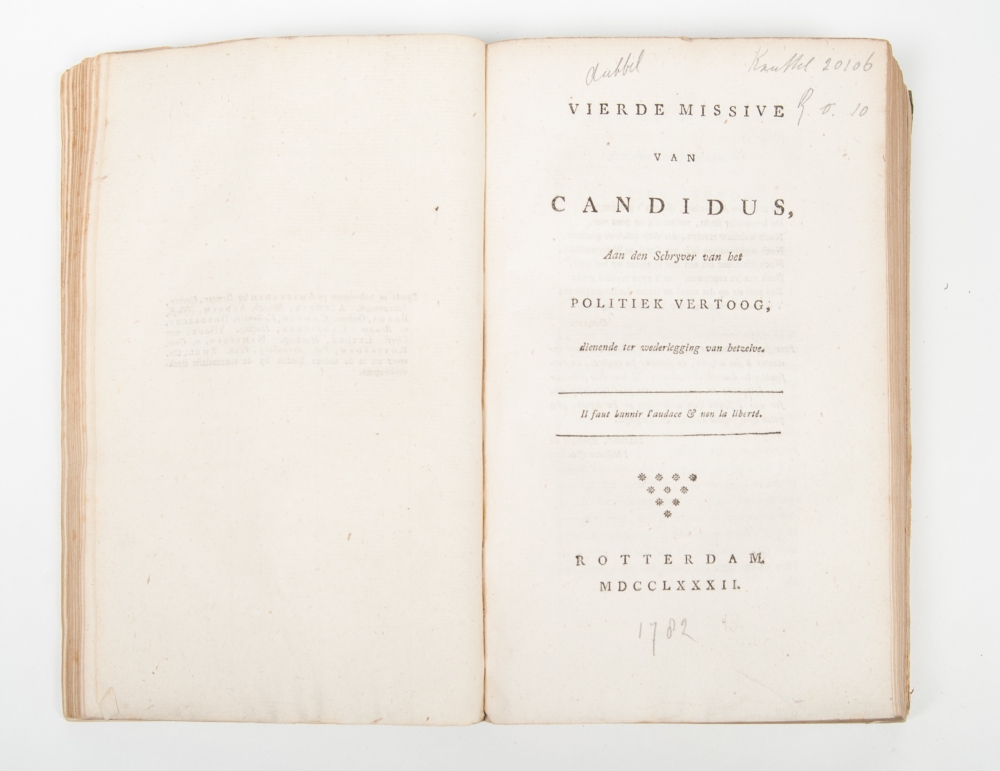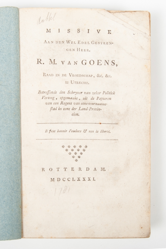 Combined with: Missive aan den Wel Edel Gestrengen Heer R.M. van Goens (...) Betreffende den Schryver van zeker Politiek Vertoog, opgemaakt uit de papieren van een Regent van eene voornaame stad in eene der Land Provincien. Rotterdam. 1781. Bound together with: Vierde Missive van Candidus [pseud. of Willem van Irhoven van Dam]. Rotterdam. 1782 and Vijfde Missive van Candidus. Rotterdam. 1782. Cf. Knuttel 19761, 20106 and 20108.