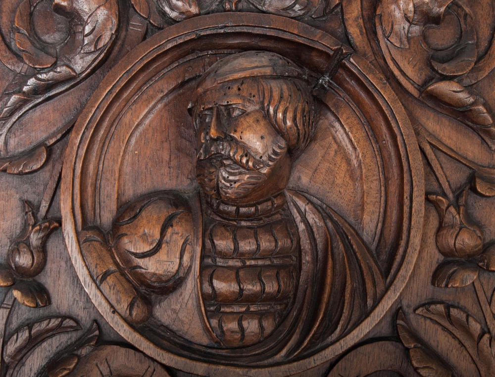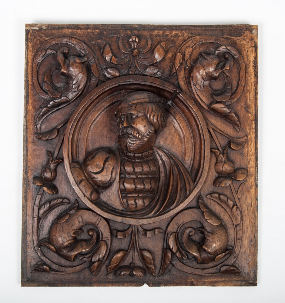 Relief of male buste, surrounded by flora. Oak. Presumably from late-medieval chest or cupboard. 40 x 35 cm. Head with a few old wormholes.