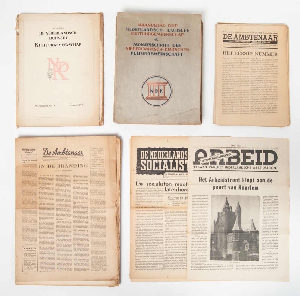 De Ambtenaar. "Speciale uitgave van "Arbeid" voor de hoofdafdeeling "openbare lichamen" van het Nederlandsche Arbeidsfront". Supplement of magazine "De Arbeid". 43 issues of this magazine, between 7 August 1942 "Het eerste nummer" and 15 September 1944 + Maandblad de Nederlandsche-Duitsche Kultuurgemeenschap. 24 issues of this monthly between 1942 and 1944 - and 12 more e.g. Arbeidsfront.
