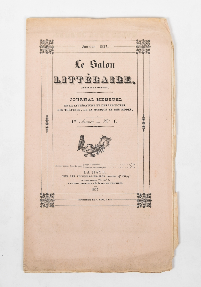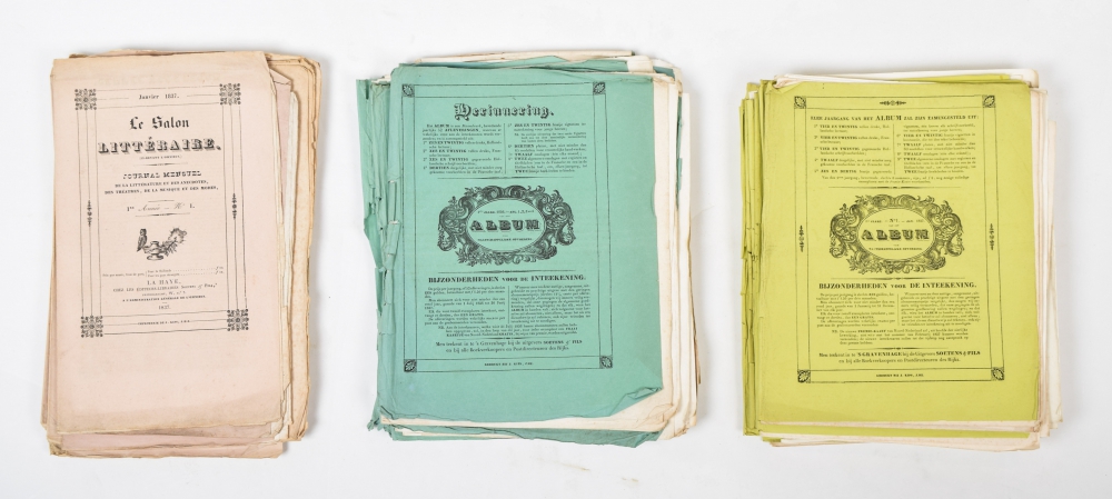 Salon Litteraire. Année 1. La Haye, 1837. Loose in original wrappers. With: Album voor Maatschappelijke Opvoeding. Year 1-2. 1836-1837. Loose in original (light) green wrappers (here and there slightly torn along spine).