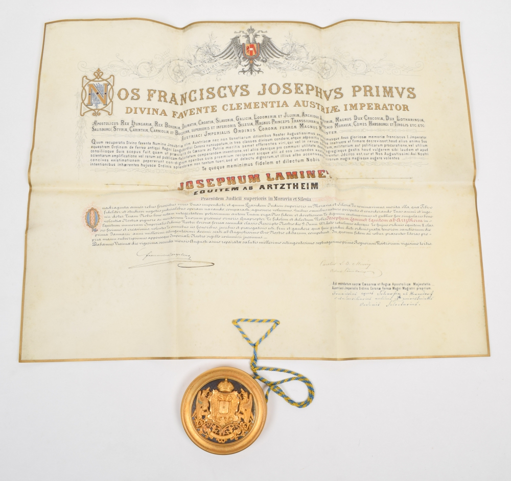 Document on vellum (lambskin) in print and hw., Latin text, belonging with the Austrian Imperial Diploma of the Order of the Iron Crown, second class, awarded to Knight Josephus Laminet von Artztheim in 1871. The document is signed by Franz Josef I [Emperor of Austria and Hungary], the Chancellor's representative, Carolus L.B. Mecsery and the secretary of the Imperial Apostolate, Franz Scharfen ab Hennedorf.